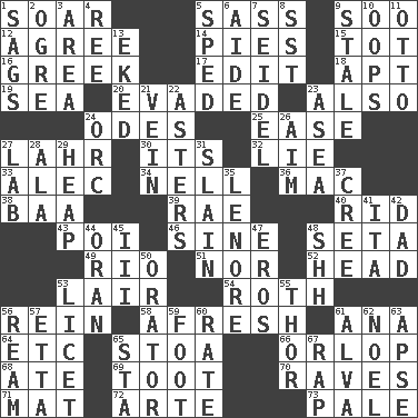 ACROSS 1. Fly high 5. Backtalk 9. "Barney Miller" actor Jack 12. Match 14. Sliced desserts 15. Small child 16. Of Greece 17. Prepare for publication 18. Fitting 19. Ocean 20. Dodged 23. In addition 24. Lyric poems 25. Relaxation 27. Cowardly lion portrayer 30. It is 32. Falsehood 33. Actor Baldwin 34. 1994 drama film starring Jodie Foster 36. Apple computer (short form) 38. Sound made by sheep 39. Actress Charlotte 40. To free from 43. Luau course 46. Trig term 48. Stalk of a moss capsule 49. _ de Janeiro 51. And not 52. Froth on beer 53. Den 54. Writer of Portnoy's Complaint (1969) 56. It's straight from the horse's mouth 58. Anew 61. Santa ___, CA 64. And so on (abbr.) 65. Portico 66. Lowest deck of a ship 68. Had dinner 69. A blast of a horn 70. All-night dance parties 71. Floor covering 72. Johnson of "Laugh-In" 73. Light colored DOWN 1. Settles 2. Legendary monster 3. Type of rug 4. To separate or throw off 5. Hurried 6. Helper 7. Beer mug 8. Fast jet (abbr.) 9. Showing deterioration from age 10. I made a mistake 11. Von Bismarck 13. Supplemented with great effort 21. Distinctive style or manner 22. Michaelmas daisies 23. Toward the sea 24. The grampus (Milton) 26. Direct toward a target or goal 27. Experiment locale 28. Chicken ___ king 29. Pile 31. Killed 35. Poe poem 37. Algonquian 41. Call ___ day 42. Male parent 44. NW Algerian seaport 45. One more than two 47. Greek god of love 48. Quiet! 50. Speaker 53. It is permitted: Lat. 55. Son of Odin 56. 480, 500 or 516 sheets of paper 57. Singer James 59. One third of a yard 60. Assign a rank or rating to 61. Inventor's middle name 62. Christmas carol 63. Domed church section 65. R.R. building 67. Reproach for some lapse or misdeed