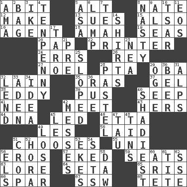 ACROSS 1. "This won't hurt ____!" 5. The first octave above the treble staff 8. Nathan's nickname 12. Create 13. Institutes legal proceedings 15. In addition 16. Rep 18. Nursemaid 19. Oceans 20. Infant food 22. Hard copy producer 24. Blunders 26. Marina Del _, California 27. Christmas carol 28. Parent Teacher Assoc. 29. Chief or king in Benin or Nigeria 32. (Had) reclined 35. Mouths or openings 37. Set 38. Whirlpool 39. Fluid product of inflammation 40. Ooze 41. Born 42. Confront 43. Possessive pronoun 44. Heredity factor (abbr.) 45. Directed 46. Singer James 49. French article 50. Put down 51. Elects 55. Corn or form start 56. Greek god of love 57. Supplemented with great effort 59. Theater features 63. Old wives' tales, e.g. 64. Stalk of a moss capsule 65. Indian titles of respect 66. Practice fight 67. Compass dir. 68. Wig DOWN 1. Nursemaid (var.) 2. Container for groceries 3. Eisenhower's nickname 4. 3-inch nail 5. White ___ sheet 6. Mass 7. Pull apart 8. Offensive 9. Toward shelter 10. Russian ruler of old 11. Greek goddess of the dawn 14. Chest coverings 17. Edible starchy tuberous root 21. Before (prefix) 23. Teachers' org. 25. Slanted 28. Soft color 29. Double curve, resembling the letter S 30. Fermented drink made from hops 31. High mountains 32. Grant temporary use of 33. An important port of Yemen 34. The content of cognition 36. Regret 40. Most questionable 42. Makes clutter 45. Lion 47. The 19th letter of the Greek alphabet 48. Metal containers 49. Failure 51. Riding implement 52. Israeli folk dance 53. Makes supply last 54. Arranges properly for use 56. Raised railways 58. Fool 60. "We ___ not amused" (Victoria) 61. Teat (slang) 62. Compass dir.