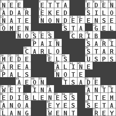 ACROSS 1. Born 4. Singer James 8. Genesis locale 12. The sixth month of the Jewish calendar 14. Made supply last 15. Grain storage tower 16. Nathan's nickname 17. Unrelated to defense, as in spending 20. Sign of something about to happen 21. R.R. building 22. Set 23. Olfactory organs 27. Baby bed with high sides 29. Ache 31. Indian skirt 34. Monte _, Las Vegas Hotel/Casino 35. Play the lead 36. Ancient Persian 39. Raised railways 41. United States Postal Service (abbr.) 42. Length times width 43. Place in a line 46. Friends 47. Observe 48. A really long time 51. Sadhe (variant) 54. Dripping 56. _ tizzy (2 wds.) 58. Against 61. The property of being fit to eat 66. A whole individual unit 67. Small Philippine buffalo 68. Snake ____ (dice throw) 69. Bristle 70. Austrian-born American filmmaker Fritz 71. Left 72. Marina Del _, California DOWN 1. Billionth: prefix 2. Dutch treat 3. Consumed 4. Car or cant ending 5. Ring climax 6. Nine, plus one 7. Sums up 8. Compass dir. 9. Empty-headed or silly people 10. Otherwise 11. Christmas carol 13. Western Nevada city 18. And so on (abbr.) 19. Distant 24. Health resort 25. Ewer handle 26. Filth; sediment 28. Come out of 30. Pitcher Ryan 32. Hit sharply and swiftly 33. Big collection agency 34. Desist 36. Atlas unit 37. Epoch 38. Conveyance 40. Narrow, elongated depression 44. It is 45. Teachers' org. 49. Lubricate 50. Compass dir. 52. Raised platform 53. Keyboard key 54. Welt 55. Pulitzer Prize-winning author Ferber 57. Afresh 59. False hair 60. "If ____ say so..." 62. Paper or plastic container 63. Sight organ 64. Elected rep. 65. Fast jet (abbr.)