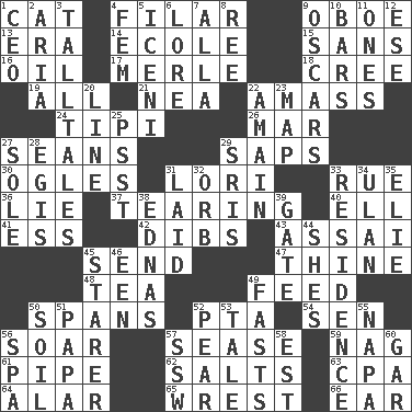 ACROSS 1. Domesticated feline 4. Of or pertaining to a thread or threads 9. Mitch Miller's instrument 13. Epoch 14. Learning spot: Fr. 15. Without 16. Petroleum 17. Haggard of country music 18. Algonquian 19. 100% 21. Teachers' org. 22. Collect or gather 24. Native american tent (variation) 26. Impair 27. Seines 29. Plant excrements 30. Stares 31. Australian parrot (variant) 33. Regret 36. Whopper 37. Separating forcefully 40. Pipe bend 41. Double-curved letter 42. Claim 43. Slender Brazilian palm 45. Transmit 47. One or ones belonging to thee 48. Beverage made from leaves 49. Nourish 50. Connects, as a bridge 52. Parent Teacher Association (abbr.) 54. Elected rep. 56. Fly high 57. Gospel singer Marvin 59. Tired old horse 61. Corncob 62. Table seasonings 63. Accounting whiz (abbr.) 64. Having or resembling wings 65. Obtain by seizing forcibly or violently 66. Ewer handle DOWN 1. Corporate head (abbr.) 2. Roberta Peters solo 3. Baron Munchausen's specialties 4. Opposite of masc. 5. Ancient Celtic tribe of eastern Britain 6. Old wives' tales, e.g. 7. Silent film actress Nazimova 8. Portuguese money of account (variant) 9. Motion picture awards 10. Soap units 11. Washington bills 12. Compass dir. 20. Actor's bit 22. At full speed 23. Atlas unit 25. Inconspicuous attention getter 27. Not divided or shared with others 28. The front part of a cuirass 29. Indian titles of respect 31. Put down 32. Globe 33. Dwelling 34. ____ Bator 35. Writer Wiesel 38. Ferber et al. 39. Yard entry 44. "______ My Girl" (Turtles hit) 45. A viewer who gazes fixedly 46. Car or cant ending 49. Goes without food and/or water 50. The visible part of the earth's surface 51. Dad 52. Lightbulb-shaped fruit 53. Lie 55. California wine valley 56. Health resort 57. Compass dir. 58. Eastern Standard Time (abbr.) 60. Slender fish
