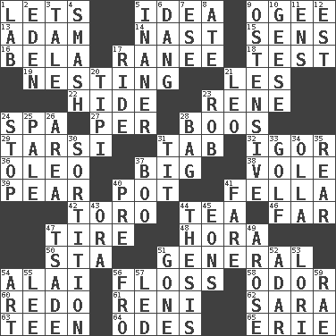 ACROSS 1. Allows 5. The main thing one is thinking about 9. Double curve, resembling the letter S 13. First man 14. Political cartoonist Thomas 15. Elected reps. 16. Actor Lugosi 17. The wife of a rajah (variant) 18. Trial 19. Snuggling 21. French article 22. Flintstone garb 23. French philosopher Descartes 24. Health resort 27. For each 28. Scornful sounds 29. Tarsus (plural) 31. Keyboard key 32. Russian composer Stravinsky 36. Butter sub 37. Massive 38. Short-tailed, large-bodied rat 39. Lightbulb-shaped fruit 40. Cooking vessel 41. Man or boy (slang) 42. "Corrida" creature 44. Afternoon social gathering 46. At a great distance 47. Become fatigued 48. Israeli folk dance 50. R.R. building 51. Commissioned military rank 54. Jai _ 56. Soft thread for cleaning between teeth 58. Aroma 60. Redecorate 61. Painter Guido (1575-1642) 62. "Two Mules for Sister ____" 63. Adolescent 64. Lyric poems 65. 4th largest of the Great Lakes DOWN 1. Experiment locale 2. Genesis locale 3. Falsehood 4. Box-office sellout 5. More lacking in sense or substance 6. Mild oath, euphamism for damn 7. Compass dir. 8. Had dinner 9. Clearly or manifestly demonstrative 10. Honkers 11. Followers of ems 12. Eastern Standard Time (abbr.) 17. Travel on an animal 20. Native american tent (variation) 21. Lion 23. Director Reiner 24. Cease 25. Diluted with white 26. Type of rug 28. Container for groceries 30. Drawing lots 31. Teat (slang) 33. Eighteen holes 34. Rounded earthenware pot or jar 35. Hitchcock's "____ Window" 37. Sometimes accompanies a hiss 40. Before (prefix) 41. Conductor's collection 43. Mouth or opening 44. College paper 45. Immeasurably long periods of time 47. Sadhe (variant) 49. Came up 51. Went 52. The sixth month of the Jewish calendar 53. Australian parrot (variant) 54. Tate display 55. Area sheltered from the wind 56. From 57. Directed 59. Actress Charlotte
