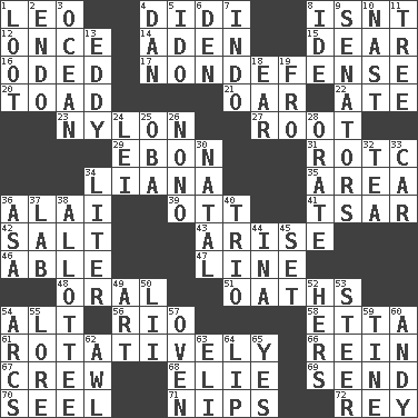 ACROSS 1. Lion 4. "You Light Up My Life" star Conn 8. Is not 12. At one time in the past 14. Arabian gulf 15. Letter starter 16. Wrote a lyric poem 17. Unrelated to defense, as in spending 20. Frog relative 21. Rowing implement 22. Had dinner 23. High-strength synthetic material 27. Carrot, for example 29. Inky black, to poets 31. College mil. group 34. Woody, climbing, usually tropical plant 35. Type of rug 36. Jai _ 39. Baseball player Mel 41. Russian ruler of old 42. Table seasoning 43. Get up 46. Competent 47. Actor's bit 48. Of the mouth 51. Expletives 54. The first octave above the treble staff 56. River (Sp.) 58. Singer James 61. Producing rotation 66. It's straight from the horse's mouth 67. Ship's personnel 68. Writer Wiesel 69. Transmit 70. Sew up the eyelids of hawks and falcons 71. Pinches, bites 72. Marina Del _, California DOWN 1. Plunder 2. Inside; within (prefix) 3. Sea 4. One of the 12 tribes of Israel 5. Wedding promise 6. Lair 7. _ china 8. Binary compound 9. Elected representatives 10. Political cartoonist Thomas 11. Family _ (genealogy) 13. Whirlpool 18. Hearing organ 19. Away 24. Flowery wreath 25. Chief or king in Benin or Nigeria 26. Words to Nanette 28. Declaim 30. Brizilian seaport 32. Afternoon social gathering 33. Auto 34. 61 cubic inches 36. White ___ sheet 37. Experiment locale 38. One to whom something is allotted 40. Musical group of three 44. _ tizzy (2 wds.) 45. Put into a specified state 49. Nonscientific branch of learning 50. Cards in a Roman deck? 52. Possessive pronoun 53. Navigate 54. Curves 55. Old wives' tales, e.g. 57. Baking chamber 59. Prong on a fork 60. "60 Minutes" Commentator Rooney 62. Leather borer 63. Biblical high priest 64. Mouth edge 65. It is so