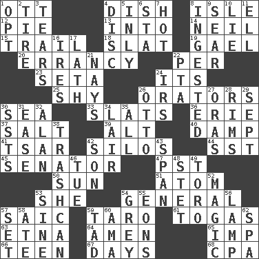 ACROSS 1. Baseball player Mel 4. Food container 8. Small island 12. Sliced dessert 13. To the inside or interior of 14. Famous astronaut Armstrong 15. Hang back 18. Narrow board 19. Highlander 20. Tendancy to err 22. For each 23. Bristle 24. ___ a Wonderful Life 25. Like a shrinking violet 26. Speakers 30. Ocean 33. Narrow boards 36. 4th largest of the Great Lakes 37. Table seasoning 39. Keyboard modifier key 40. Moist 41. Russian ruler of old 42. Grain storage towers 44. Fast jet (abbr.) 45. Elected representative 47. Pacific Standard Time (abbr.) 50. Player for Phoenix 51. Smallest unit of an element 53. A female animal or person 54. Commissioned military rank 57. Ketch in the Levant 59. Edible starchy tuberous root 61. Ancient Roman robes 63. Inactive volcano in Sicily 64. So be it 65. Naughty child 66. Adolescent 67. 24-hour periods 68. Numbers guy (abbr.) DOWN 1. Choose 2. Become fatigued 3. Lacerates 4. Flat circle 5. Inwardly 6. R.R. building 7. Being at a high temperature 8. Swallowed 9. Dry up 10. Whopper 11. Pipe bend 16. Angers 17. Thin strip of wood or metal 21. Negative votes 22. Parent Teacher Association (abbr.) 24. Big collection agency 26. "Beetle Bailey" pooch 27. Mouths or openings 28. Basketball hoops 29. Back-to-school mo. 30. Fast planes 31. Comfort 32. Actor Alda or Thicke 34. Den 35. Everything 38. File 13 42. Male offspring 43. Connect, as a bridge 46. Third day of the wk. 48. Proofreading order 49. "Corrida" creature 52. Mysterious quality of enchantment 53. Trig term 54. Jennifer or Joel 55. Immeasurably long periods of time 56. Desk light 57. Put into a specified state 58. Had dinner 59. Small amount or degree 60. Housemaid (var.) 62. Health resort