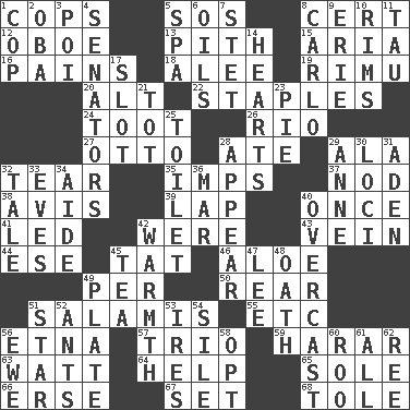 ACROSS 1. 911 reaches them 5. Distress signal 8. Certainty 12. Mitch Miller's instrument 13. Essential or central part 15. Operatic vocal solo 16. Aches 18. Toward shelter 19. Tall New Zealand timber tree 20. The first octave above the treble staff 22. Paper fasteners 24. A blast of a horn 26. _ de Janeiro 27. "Beetle Bailey" pooch 28. Had dinner 29. Wing 32. Rend 35. Naughty children 37. Allow head to fall sleepily 38. Deliberation 39. Infant locale 40. Single time 41. Directed 42. We are 43. Distinctive style or manner 44. Compass dir. 45. Make lace 46. _ vera 49. For each 50. Bring up, as a child 51. Deli grouping 55. And so on (abbr.) 56. Inactive volcano in Sicily 57. Musical group of three 59. Ethiopian city, capital of Harari 63. Electrical Unit 64. Aid 65. Not divided or shared with others 66. Celtic language 67. Put into a specified state 68. Lacquered or enameled metalware DOWN 1. Police officer (slang) 2. Chief or king in Benin or Nigeria 3. Luau course 4. Elected representatives 5. Health resort 6. Lubricates 7. Proofreading order 8. Monte _, Las Vegas Hotel/Casino 9. One of the Great Lakes 10. Basketball hoops 11. The 19th letter of the Greek alphabet 14. Centers 17. Narrow opening 21. Small child 23. Sliced dessert 25. Bathroom plumbing fixture 28. Become visible 29. Queen of England 1702-14 30. Locales 31. Arabian gulf 32. Lie 33. Nights before holidays 34. Assistant 36. Third mo. 40. Cloudy 42. Heat 45. Beverage made from leaves 47. Area sheltered from the wind 48. Pledge 49. Food holder 51. Play the lead 52. Pismires 53. Angers 54. Filth; sediment 56. She-sheep 58. Elect 60. Friend of Pooh 61. Everything 62. To sift