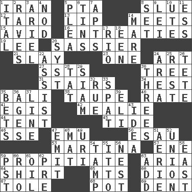 ACROSS 1. SW Asia republic 5. Parent Teacher Association (abbr.) 8. Turn sharply 12. Edible starchy tuberous root 13. Mouth edge 14. Confronts 15. Enthusiastic 16. Pleas 19. Area sheltered from the wind 20. More impudent 21. Kill 23. Single 24. Nonscientific branch of learning 27. Fast planes 30. Woody plant 31. Flight of steps 34. Behest 35. Indonesian resort city 38. Grayish beige 40. Pace 41. Armor plate that protects the chest 42. Ear of corn 44. Portable shelter 45. Event that recurs at intervals 46. Compass dir. 47. Australian flightless bird 50. Son of Isaac 53. Chrissie's court nemesis 57. Compass dir. 59. Conciliate 63. Operatic vocal solo 64. Upper-body garment 65. Mountains (abbr.) 66. "Vaya con ____" 67. Lacquered or enameled metalware 68. Plant holder 69. Undesirable depression on a surface DOWN 1. Slanted text style (abbr.) 2. All-night dance parties 3. Satellite of Uranus 4. Dreamland 5. Entreaty 6. Airtight sealed metal containers 7. Tenement units (abbr.) 8. Put into a specified state 9. Luau accessory 10. Shoshoni 11. Double-curved letter 14. Female horse 17. _ de Janeiro 18. Car or cant ending 20. System (abbr.) 22. Aid 24. Length times width 25. Respite 26. Wig 28. Make lace 29. Thailand, formerly 30. Trios 32. Sorrow 33. Argument over a trivial matter 35. Wagers 36. Grows older 37. Actor's bit 39. Connecticut Ivy Leaguer 43. The content of cognition 47. Give off 48. Floor protector 49. RI univ. 51. Nest on high 52. The state of being joined or united 54. Pack (down) 55. "Tell ____ the Marines!" 56. A home for chicks 58. 90 degrees 59. Pacific Standard Time (abbr.) 60. 17th letter of the Greek alphabet 61. Lubricate 62. Before (prefix) 63. Increase
