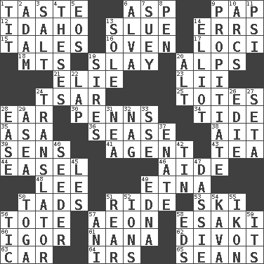 ACROSS 1. Clothes sense 6. Cleo's killer 9. Infant food 12. Potato state 13. Turn sharply 14. Blunders 15. Lies 16. Baking chamber 17. Locales 18. Mountains (abbr.) 19. Kill 20. High mountains 21. Writer Wiesel 23. Cards in a Roman deck? 24. Russian ruler of old 25. Hauls 28. Ewer handle 30. Actor Sean's family 34. Event that recurs at intervals 35. White ___ sheet 36. Gospel singer Marvin 38. Small island 39. Elected reps. 41. Rep 43. Afternoon social gathering 44. Artist's stand 46. Helper 48. Area sheltered from the wind 49. Inactive volcano in Sicily 50. Small amounts or degrees 51. Travel on or in a vehicle 53. What Jean-Claude Killy likes to do 56. Carryall 57. Period of immesurable duration 58. 1973 Nobel Price Winner (Physics) Leo 60. Composer Stravinsky 61. Grandmother 62. A piece of turf (Scot.) 63. Automobile 64. Big collection agency 65. Actors Connery and Penn DOWN 1. Teat (slang) 2. First man 3. Table seasoning 4. College papers 5. Greek goddess of the dawn 6. Inventor's middle name 7. Chop _ 8. Writing instrument 9. Appease 10. Curves 11. 23rd letter of the Greek alphabet 13. Not divided or shared with others 14. American author Paul (1891-1958) 19. Fathers 20. The first octave above the treble staff 22. Infant locale 24. Interpreter 26. Singer Brickell 27. Stalk of a moss capsule 28. Comfort 29. At sea 31. Teachers' org. 32. Tired old horse 33. Compass dir. 37. Maternal 40. Sowing specialist 42. Shallow baking pan 45. French article 47. Hyrax 49. Pulitzer Prize-winning author Ferber 50. Ancient Roman robe 51. Hitchcock's "____ Window" 52. Charged atoms 54. Polynesian shrub of the pepper family 55. Image 56. Nervous spasm 57. Cuckoo 58. Begley and Asner 59. It is