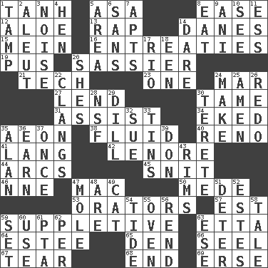 ACROSS 1. Hyperbolic tangent 5. White ___ sheet 8. Comfort 12. _ vera 13. Strike 14. Natives or inhabitants of Denmark 15. Chow _ 16. Pleas 19. Product of festering 20. More lively and spirited 21. Technical work 23. Single 24. Make imperfect 27. Grant temporary use of 30. Not wild 31. Aid 34. Made supply last 35. Period of immesurable duration 38. Watery 40. Former U.S. Attorney General Janet 41. Long (Scottish) 42. Poe poem 44. Curves 45. In a ____ (agitated or irritated) 46. Compass dir. 47. Big _ 50. Ancient Persian 53. Speakers 57. Eastern Standard Time (abbr.) 59. Supplementary 63. Singer James 64. First name in cosmetics 65. Lair 66. Stitch closed the eyes of (a falcon) 67. Lacerate 68. Conclude 69. Celtic language DOWN 1. Pack (down) 2. Native American of Southwest Alaska 3. Annoying sound 4. Layer 5. Type of rug 6. Without 7. Tenement units (abbr.) 8. Erode 9. Cuckoo 10. Observe 11. Double-curved letter 14. Have the gumption 17. _ de Janeiro 18. Car or cant ending 20. "______ My Girl" (Turtles hit) 22. Rings loudly 24. Cause to be 25. So be it 26. Make new 28. Overdraft (abbr.) 29. Deli pickle 30. Cylindrical with tapered ends 32. Take to court 33. Canisters 35. Actor Alda or Thicke 36. Merit 37. At one time in the past 39. Spanish title 43. Basketball hoops 47. Undercover agent 48. "We ___ not amused" (Victoria) 49. Feline 51. Prevent from occurring 52. _____ Park, CO 54. Event that recurs at intervals 55. Baking chamber 56. Tear apart 58. Lie 59. Put into a specified state 60. Purpose 61. Parent Teacher Association (abbr.) 62. For each 63. Compass dir.