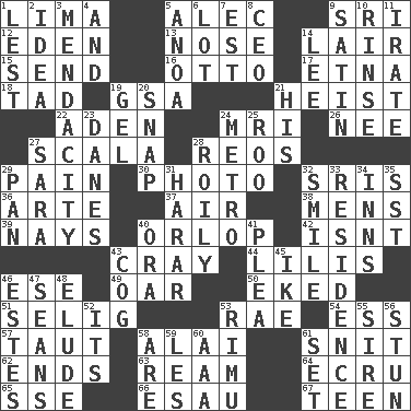 ACROSS 1. Pale green bean 5. Actor Baldwin 9. _ Lanka 12. Genesis locale 13. Sense of smell 14. Den 15. Post 16. "Beetle Bailey" pooch 17. Inactive volcano in Sicily 18. Small boy 19. Girls' org. (abbr.) 21. Robbery 22. Arabian gulf 24. Medical imaging device (abbr.) 26. Born 27. Any of the three canals of the cochlea 28. Vintage cars 29. Ache 30. Picture 32. Indian titles of respect 36. Johnson of "Laugh-In" 37. Wind 38. Not women's 39. Negative votes 40. Lowest deck of a ship 42. Is not 43. Supercomputer manufacturer 44. Ms. Damita and namesakes 46. Compass dir. 49. Rowing implement 50. Supplemented with great effort 51. Former Milwaukee Brewers owner Bud 53. Actress Charlotte 54. Double-curved letter 57. Drawn tight 58. Mountain range southwest of Kyrgyzstan 61. In a ____ (agitated or irritated) 62. Extremities 63. 480, 500 or 516 sheets of paper 64. Shade of tan 65. Compass dir. 66. He sold his birthright 67. Adolescent DOWN 1. For fear that 2. The main thing one is thinking about 3. Ananias' fault 4. Added to 5. Small Philippine buffalo 6. Car dealer's back yard 7. Eastern Standard Time (abbr.) 8. Corporate head (abbr.) 9. Smooth fabric 10. Wash lightly 11. Feeling or showing extreme anger 14. Area sheltered from the wind 19. Set 20. Fastener 21. Part of HMS, perhaps 23. Natives or inhabitants of Denmark 24. Paris' subway 25. Friend of Pooh 27. "Two Mules for Sister ____" 28. Agitated, as a liquid 29. Baking dish 31. Ethiopian city, capital of Harari 32. Grin 33. Dwelling 34. Taverns 35. Fast jet (abbr.) 40. Mouth or opening 41. Entreaty 43. Gear tooth 45. Eisenhower's nickname 46. _____ Park, CO 47. Actors Connery and Penn 48. Evade 52. It is 53. Tall New Zealand timber tree 55. Father 56. Surprise greatly 58. "We ___ not amused" (Victoria) 59. French article 60. American Automobile Association (abbr.) 61. Put into a specified state