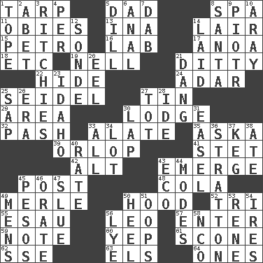 ACROSS 1. Canvas cover 5. Male parent 8. Health resort 11. Off-Broadway awards 13. _ tizzy (2 wds.) 14. Den 15. Stone: prefix 16. Experiment locale 17. Small Philippine buffalo 18. And so on (abbr.) 19. 1994 drama film starring Jodie Foster 21. Short, simple song 22. Flintstone garb 24. The sixth month of the Jewish calendar 25. A glass for beer 27. Shallow baking pan 29. Type of rug 30. Cabin 32. Romantic infatuation 33. Having winglike extensions 35. "____ silly question..." 39. Fourth or lowest deck 41. Proofreading order 42. Keyboard modifier key 43. Develop 45. Mail 48. Root beer relative 49. Haggard of country music 50. Parka part 52. Three (prefix) 55. He sold his birthright 56. Lion 57. Keyboard key 59. Brief written record 60. Slangy assent 61. Biscuitlike quick bread 62. Compass dir. 63. Raised railways 64. Singles DOWN 1. Drink excessively 2. Collude with 3. Actors Guy, Robert Welles, and Clint 4. For each 5. Deli pickle 6. Of or related to the anus 7. Small moist lump or mass 8. Before Barbara or Clara 9. Peter (Polish) 10. Like ___ of sunshine 12. Something which is sent 14. Put down 20. Snakelike fish 21. Mild oath, euphamism for damn 23. Potato state 25. Plant excrement 26. Epoch 27. Small child 28. Binary compound 30. Pet locale 31. Artist's stand 33. Everything 34. Car dealer's back yard 36. Ski resort town in Vermont 37. Cask 38. Had dinner 40. Pace 43. Environmental prefix 44. Methods 45. Mexican monetary units 46. Speak pompously 47. Change direction abruptly 49. Not women's 50. Person who is morally reprehensible 51. I made a mistake 53. French philosopher Descartes 54. Angers 56. Potassium hydroxide 58. Non-commissioned officer (abbr.)