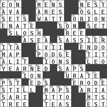ACROSS 1. A really long time 4. Not women's 8. Egg locale 12. Actress Gardner 13. Ancient Greek god of war 14. Stare at amorously 15. Arranges properly for use 17. Electrical Unit 18. Greek mythologigal hunter 19. Related on the mother's side 21. Boy, to dad 23. Put into a specified state 24. Agitate, as a liquid 26. To sift 28. Toward the sea 30. More lively and spirited 34. Call ___ day 37. 57 in ancient Rome 39. Inside; within (prefix) 40. Atlas unit 41. Plash 43. Teat (slang) 44. Set down 46. Charged particles 47. Lion 48. Had a strong desire 51. Plant excrements 54. Electrically charged atom 55. A salt of uric acid 58. Pacific Standard Time (abbr.) 61. Begley and Asner 63. Wear away 65. Free from disturbance or agitation 67. Atlas contents 71. Roberta Peters solo 72. Indian skirt 73. "Tell ____ the Marines!" 74. Mountains (abbr.) 75. Family _ (genealogy) 76. Beverages made from leaves 77. Eastern Standard Time (abbr.) DOWN 1. Comfort 2. Baking chambers 3. Brizilian seaport 4. Informal term for the mouth 5. Period 6. Remaining after all deductions 7. Fast planes 8. And not 9. The front part of a cuirass 10. _ gin 11. Portable shelter 16. Portico 18. Washington bills 20. Curvy letter 22. Mouth or opening 25. Assist 27. Compass dir. 29. Stay clear from 30. Attaches a signature 31. International (abbr.) 32. Singer Brickell 33. Printing process, for short 34. "If ____ say so..." 35. Story 36. Capital of Western Samoa 38. Wedding promise 42. He sold his birthright 45. Three (prefix) 49. Christmas carol 50. Conclude 52. Before (prefix) 53. "Two Mules for Sister ____" 56. Singer Mel 57. Proofreads 58. Inconspicuous attention getter 59. Play the lead 60. Become fatigued 62. Stricken, poetically 64. 90 degrees 66. Untruth 68. Had dinner 69. Parent Teacher Assoc. 70. Distress signal