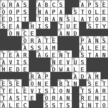 ACROSS 1. Pate de foie ____ 5. Lettered men learn these first 9. Domed church section 13. I made a mistake 14. California wine valley 15. Took without asking 16. Prepare for publication 17. Interpreter 19. Ocean 20. Part of HMS, perhaps 21. Third day of the wk. 22. Filthy place 23. Single time 25. Plus 26. Speak pompously 30. Zero-star reviews 34. Indian state 35. Toward shelter 36. Separate forcefully 39. Rep 42. Comedian Laurel of Laurel & Hardy 43. Deliberation 44. Mole, birthmark 46. Ancient Persian 47. A sleeping potion; an opiate (poet.) 48. Reproach for some lapse or misdeed 51. First of billions? 54. Compass dir. 57. Single 58. Storage container 60. Put into a specified state 62. Household entertainment appliance 65. Russian ruler of old 66. Clothes sense 67. NW Algerian seaport 68. Painter Guido (1575-1642) 69. Actor Baldwin 70. Fast planes 71. To the inside or interior of DOWN 1. Moves 2. Cowboy competition 3. Bee-related 4. Fast jet (abbr.) 5. Against 6. Soap units 7. Numbers guy (abbr.) 8. Before Barbara or Clara 9. "One Day ___ Time" 10. Plant holders 11. Position in a hierarchy or organization 12. Suggestive of the supernatural 15. Downhill vehicle 18. Player for Phoenix 20. Possessive pronoun 24. Rough 27. White ___ sheet 28. Label 29. Make improvements or corrections to 30. Went by 31. Keyboard modifier key 32. Teachers' org. 33. Elected rep. 36. Scottish cap 37. First lady 38. Assist 40. ___ Haven, CT 41. Federal power corp. 45. ____ Bator, Mongolia 48. Be footloose 49. Cuckoo 50. Mexican monetary units 52. NE Netherlands city 53. Intended 54. Singer James 55. Lick closed 56. Otherwise 58. Water vessel 59. Lodging establishments 61. Musical group of three 63. And so on (abbr.) 64. Big collection agency 65. Three (prefix)
