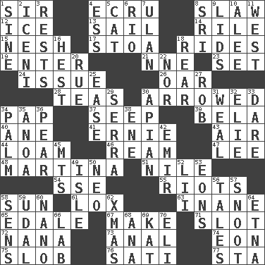 ACROSS 1. Title for a knight 4. Shade of tan 8. Cole _ (cabbage dish) 12. Frozen water 13. Move on water 14. Cause heat under the collar 15. Delicate 17. Portico 18. Amusement-park features 19. Keyboard key 21. Compass dir. 23. Arrange properly for use 24. Come out of 26. Boat paddle 28. Afternoon social gatherings 30. Moved like an arrow 34. Infant food 37. Ooze 39. Actor Lugosi 40. One (Scot) 41. Bert's buddy 43. Wind 44. Rich soil 46. 480, 500 or 516 sheets of paper 47. Area sheltered from the wind 48. Chrissie's court nemesis 51. The longest river in the world 54. Compass dir. 55. Debaucheries 58. Player for Phoenix 61. Brine-cured salmon 63. Lacking in sense or substance 65. Peak District village in England 67. Cause to be 71. Narrow, elongated depression 72. Nanny 73. Of or related to the anus 74. Period of immesurable duration 75. Messy guy 76. Suttee (variant) 77. R.R. building DOWN 1. Trig term 2. Ancient Celtic tribe of eastern Britain 3. Musical pauses 4. Double-curved letter 5. Feline 6. _ de Janeiro 7. ____ Bator 8. _ Lanka 9. Flaplike coverings 10. Toward shelter 11. 270 degrees 16. Behest 18. Bring up, as a child 20. Regret 22. Not either 25. Comfort 27. Director Reiner 29. Father Junipero _ 30. Bee-related 31. Welt 32. Writer Wiesel 33. Have the gumption 34. Inside of hand 35. Small Philippine buffalo 36. Lightbulb-shaped fruit 38. Compass dir. 42. Arab leader 45. Mountains (abbr.) 49. Small island 50. Modern: prefix 52. Cards in a Roman deck? 53. Immeasurably long periods of time 56. Falsehoods 57. Snout, nose 58. Elected reps. 59. Freehold land 60. Billionth: prefix 62. Dec. holiday 64. Inactive volcano in Sicily 66. Experiment locale 68. Santa ___, CA 69. Krazy ___ of comics 70. Connecticut Ivy Leaguer