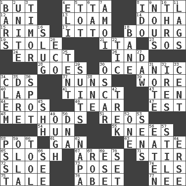 ACROSS 1. On the contrary 4. Singer James 8. International (abbr.) 12. Black tropical American cuckoo 13. Rich soil 14. Capital of the state of Qatar 15. Basketball hoops 17. "Tell ____ the Marines!" 18. French market town 19. Took without asking 21. Call ___ day 23. Distress signal 24. Spew [out] 26. Working for oneself (abbr.) 28. Leaves 30. Pertaining to the sea 34. Music discs 37. Religious women 39. Had on 40. Infant locale 41. Colored lightly or faintly 43. Nine, plus one 44. Greek god of love 46. Separate forcefully 47. Eastern Standard Time (abbr.) 48. Modes 51. Vintage cars 54. Attila the _ 55. Leg joints 58. Cooking vessel 61. Separate the seeds from cotton 63. Related on the mother's side 65. Agitate, as a liquid 67. Ancient Greek god of war 71. Agitate 72. _ gin 73. Introduce or present, as a question 74. Raised railways 75. Lie 76. Collude with 77. Born DOWN 1. Oblong pieces of solid material 2. Join together 3. The easternmost of the Lesser Sundas 4. Biblical high priest 5. Small child 6. Make lace 7. Mine, in Marseilles 8. Wedding promise 9. Horse sense 10. Through, poetically 11. Fails to keep up a pace 16. A hard, heavy blow 18. Object of repulsion 20. Environmental prefix 22. Nervous spasm 25. Portable shelter 27. Fool 29. Sets of matching outer garments 30. Witty Wilde 31. Musical sound 32. Angers 33. Penny 34. Clement's nick name 35. Have the gumption 36. Specific locale 38. Compass dir. 42. Long journey 45. Quiet! 49. Ending for "Through" and "Enough" 50. Heredity factor (abbr.) 52. Single 53. Elected reps. 56. Eroded 57. Vertical member of a panel or frame 58. Inconspicuous attention getter 59. Spanish pot 60. Utensil 62. California wine valley 64. Celtic language 66. Observe 68. Director Reiner 69. Compass dir. 70. Arrange properly for use