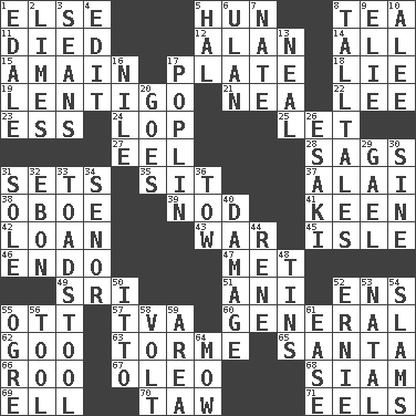 ACROSS 1. Otherwise 5. Attila the _ 8. Afternoon social gathering 11. Passed on 12. Actor Alda or Thicke 14. Everything 15. With great haste 17. Food holder 18. Whopper 19. Small, flat, pigmented spot on the skin 21. Teachers' org. 22. Area sheltered from the wind 23. Double-curved letter 24. Chop off 25. Allow 27. Snakelike fish 28. Sinks 31. Puts into a specified state 35. Be seated 37. Jai _ 38. Mitch Miller's instrument 39. Lower and raise head in agreement 41. Peachy ____! 42. Grant temporary use of 43. Armed conflict 45. Small island 46. Inside; within (prefix) 47. Was introduced to 49. _ Lanka 51. Black tropical American cuckoo 52. Followers of ems 55. Baseball player Mel 57. Federal power corp. 60. Commissioned military rank 62. Thick or sticky substance 63. Singer Mel 65. Before Barbara or Clara 66. Friend of Pooh 67. Butter sub 68. Thailand, formerly 69. Pipe bend 70. The 23rd letter of the Hebrew alphabet 71. Snakelike fish DOWN 1. Peak District village in England 2. Citrus fruits 3. Seines 4. Prepare for publication 5. Actor Linden 6. ____ Bator 7. Nathan's nickname 8. Baron Munchausen's specialties 9. Writer Wiesel 10. Toward shelter 13. Be tempered by heat 16. Mediterranean tributary 17. Cotton for raincoats, e.g. 20. Leaves 26. 1973 Nobel Price Winner (Physics) Leo 29. Highlander 30. Trig term 31. Flatfish 32. Inky black, to poets 33. Inedible or poisonous agaric 34. Sir (Sp.) 36. Pull behind 40. Break 44. French philosopher Descartes 48. Metal containers 50. "Tell ____ the Marines!" 52. Bert's buddy 53. Brizilian seaport 54. Shuts with force 55. Legendary monster 56. Implement 58. Electrical Unit 59. Type of rug 61. Relaxation 64. Cut the grass