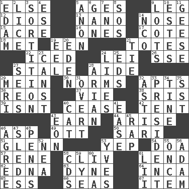ACROSS 1. Otherwise 5. Grows older 9. Part of a journey 12. "Vaya con ____" 13. Billionth: prefix 14. Sense of smell 15. Measure of real estate 16. Washington bills 17. ____ d'Azur (French Riviera) 18. Was introduced to 19. Car or cant ending 21. Hauls 22. On the rocks 24. Luau accessory 26. Compass dir. 27. Lacking originality or spontaneity 28. Assistant 29. Chow _ 30. Typical standards 32. Tenement units (abbr.) 36. Vintage cars 37. Compete 38. Indian titles of respect 39. Is not 40. Desist 42. Portable shelter 43. Merit 44. Ascend 46. Viper 49. Baseball player Mel 50. Indian skirt 51. American astronaut and politician John 53. Slangy assent 54. ___ good deed 57. French philosopher Descartes 58. 154 in Roman numerals 61. Grant temporary use of 62. Pulitzer Prize-winning author Ferber 63. Unit of force 64. South American Indian 65. Curvy letter 66. Oceans 67. A distinct part DOWN 1. Dutch treat 2. Louse (plural) 3. Conclusion 4. Compass dir. 5. Soon (poet.) 6. Separate the seeds from cotton 7. Compass dir. 8. Distress signal 9. Plunders 10. _____ Park, CO 11. Honkers 14. Non-commissioned officer (abbr.) 19. Snakelike fish 20. Genesis locale 21. Neckwear 23. 2nd pers. sing. pres. of can (arch.) 24. Citrus fruits 25. Begley and Asner 27. Observes 28. Believer in; advocate of (suffix) 29. Medical imaging device (abbr.) 31. Unconcealed 32. Moving about 33. Elected leader of a country 34. Prong on a fork 35. Fast jet (abbr.) 40. Domesticated feline 41. Relaxation 43. A really long time 45. Reproach for some lapse or misdeed 46. Match 47. Bobsleighs 48. Actor Sean's family 52. Teachers' org. 53. Jacques Cousteau's middle name 55. Single time 56. First of billions? 58. Music discs 59. Sodium hydroxide 60. _ tizzy (2 wds.) 61. Cards in a Roman deck?