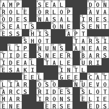 ACROSS 1. Electrical Unit 4. Lick closed 8. Spanish title 11. Hero or heavy, e.g. 13. Lowest deck of a ship 15. Actress Gardner 16. Lyric poems 17. Rhinal 18. Angers 19. Theater features 21. Single 22. Transmitted 23. Curvy letter 24. Part of HMS, perhaps 27. Fitting 29. Went for two points 30. Tarsus (plural) 34. Mouth edge 36. Religious women 39. Approach 40. Periodic rise and fall of the sea level 41. Contemptuous expression 43. Oblong pieces of solid material 44. Perfect 46. Lie 47. RI univ. 48. 1973 Nobel Price Winner (Physics) Leo 49. International (abbr.) 51. Snakelike fish 53. Unit of force equal to gravity 54. Domesticated feline 57. One who doesn't tell the truth 60. Bear (Spanish) 63. New (sp.) 65. Arches 66. Amusement-park features 69. Groove 70. Make imperfect 71. Removes the wrinkles 72. Writer Wiesel 73. Compass dir. 74. Celtic language 75. Begley and Asner DOWN 1. Came up 2. Methods 3. Entreaties 4. Boy, to dad 5. Epoch 6. In addition 7. Grant temporary use of 8. Have the gumption 9. Baking chamber 10. Political cartoonist Thomas 12. Eastern Standard Time (abbr.) 14. Entreaty 18. Byzantium, centuries later 20. Quiet! 25. Charged atoms 26. Check the growth or development of 28. Parent Teacher Association (abbr.) 29. Orators 31. Stern 32. Indian skirt 33. Big collection agency 34. Hats (slang) 35. The main thing one is thinking about 37. Teachers' org. 38. Former Milwaukee Brewers owner Bud 40. Neckwear 42. French philosopher Descartes 45. Falsehood 50. Nine, plus one 52. Australian parrot (variant) 54. Cell (Danish) 55. Shun 56. Hauls 57. Unable to walk 58. SW Asia republic 59. 1/640 square mile 61. Male parent of an animal 62. Scent 64. Purpose 67. Followers of ems 68. Compass dir.