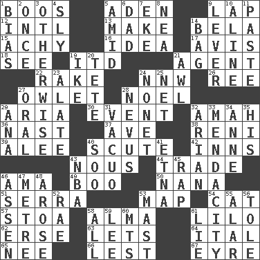 ACROSS 1. Expressions of contempt or scorn 5. An important port of Yemen 9. Pet locale 12. International (abbr.) 13. Cause to be 14. Actor Lugosi 15. Painful 16. The content of cognition 17. Opinion 18. Observe 19. It would 21. Representative 22. Immoral or dissolute person 24. Compass dir. 26. To sift 27. A small or young owl 28. Christmas carol 29. Operatic vocal solo 30. Happening 32. Housemaid 36. Political cartoonist Thomas 37. "___ Maria" 38. Painter Guido (1575-1642) 39. Toward shelter 40. Snake scale 42. Taverns 43. Horse sense 44. Barter 46. Wet nurse (var.) 49. Surprise greeting 50. Nanny 51. Father Junipero _ 53. Atlas unit 54. Feline 57. Portico 58. _ mater 61. _ and Stitch 62. Celtic language 63. Allows 64. Slanted text style (abbr.) 65. Born 66. For fear that 67. Jane of fiction DOWN 1. Prejudice 2. Single time 3. Else 4. Roguish 5. Among 6. June honoree 7. Supplement with great effort 8. Teachers' org. 9. Prying instrument 10. Place in a line 11. Thick mixture 14. Paper or plastic container 19. Mamie's husband 20. False hair 21. Leather borer 23. Having winglike extensions 24. Music written for nine 25. Remaining after all deductions 27. Relating to the mouth 28. Mole, birthmark 29. Santa ___, CA 31. In a vacuum (with "in") 32. Believer in; advocate of (suffix) 33. Ananias' fault 34. Queen of England 1702-14 35. Part of HMS, perhaps 40. "Barney Miller" actor Jack 41. Inactive volcano in Sicily 43. Basketball assoc. 45. Strike 46. NE Netherlands city 47. Distance measurement (Brit.) 48. Came up 52. Actress Charlotte 53. Vertical spar for supporting sails 55. Having or resembling wings 56. Lacquered or enameled metalware 58. 100% 59. Area sheltered from the wind 60. Mountains (abbr.) 61. Untruth