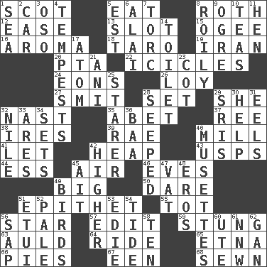 ACROSS 1. Highlander 5. Consume 8. Writer of Portnoy's Complaint (1969) 12. Relaxation 13. Groove 15. Double curve, resembling the letter S 16. Scent 18. Edible starchy tuberous root 19. SW Asia republic 20. Parent Teacher Association (abbr.) 22. Winter's stalactites 24. Immeasurably long periods of time 26. Myrna of the movies 27. Stricken, poetically 28. Arrange properly for use 29. A female animal or person 32. Political cartoonist Thomas 35. Collude with 37. To sift 38. Angers 39. Actress Charlotte 40. Place where flour is made 41. Allow 42. Pile 43. United States Postal Service (abbr.) 44. Double-curved letter 45. Atmosphere 46. Nights before holidays 49. Of large size 50. Have the gumption 51. Curse 55. Small child 56. Play the lead 57. Prepare for publication 59. Feeling sharp psychological pain 63. Old (Scot.) 64. Travel on an animal 65. Inactive volcano in Sicily 66. Sliced desserts 67. Car or cant ending 68. Stitched DOWN 1. Ocean 2. Auto 3. Bear (Spanish) 4. Storms 5. Eastern Standard Time (abbr.) 6. Jai ____ 7. Torque (variant) 8. Agitated, as a liquid 9. Legendary monster 10. Afternoon social gatherings 11. Layer 14. Bathroom plumbing fixture 17. Smallest unit of an element 21. Black tropical American cuckoo 23. Small bed 25. A viewer who gazes fixedly 28. Oozed 29. Indian titles of respect 30. Aid 31. Snakelike fish 32. "Death on the ____" 33. Ancient Greek god of war 34. Puts into a specified state 36. Sound made by sheep 40. French bagpipes 42. Having greater elevation 45. Small island 47. Large container 48. Greek god of love 49. Avian creatures 51. Needle case 52. Light colored 53. Singer Brickell 54. Periodic rise and fall of the sea level 56. Plant excrement 58. "___ Little Indians" 60. Shoshoni 61. Compass dir. 62. Separate the seeds from cotton
