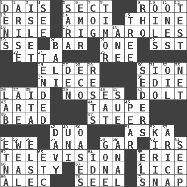 ACROSS 1. Raised platform 5. Religious group 9. Carrot, for example 13. Celtic language 14. Mine, in Marseilles 15. One or ones belonging to thee 16. The longest river in the world 17. Frustrating wastes of time 19. Compass dir. 20. Drinking establishment 21. Single 22. Fast jet (abbr.) 23. Singer James 25. Portuguese money of account (variant) 26. A person who is older than you are 30. The Jewish people; Israel 34. Sibling's daughter 35. Singer Brickell 36. Put down 39. Olfactory organs 42. Stupid person 43. Johnson of "Laugh-In" 44. Grayish beige 46. Necklace unit 47. Bull 48. Superhero pair 51. "____ silly question..." 54. She-sheep 57. Santa ___, CA 58. Slender fish 60. Big collection agency 62. Household entertainment appliance 65. 4th largest of the Great Lakes 66. Offensive 67. Pulitzer Prize-winning author Ferber 68. Louse (plural) 69. Actor Baldwin 70. Sew up the eyelids of hawks and falcons 71. Fastener DOWN 1. Lairs 2. Originate 3. Small island 4. Perceive with the eye 5. "Two Mules for Sister ____" 6. Independent ruler or chieftain 7. Gear tooth 8. The easternmost of the Lesser Sundas 9. 17th letter of the Greek alphabet 10. Petroleums 11. Washington bills 12. Trial 15. Relationship diagram 18. A saturated hydrocarbon 20. Indonesian resort city 24. Looked after 27. Lair 28. Environmental prefix 29. Musical pauses 30. Spring feasts 31. Wedding promise 32. Lubricate 33. Fish or hair follower 36. Experiment locale 37. "We ___ not amused" (Victoria) 38. Call ___ day 40. Ingest 41. Institute legal proceedings 45. Lightbulb-shaped fruit 48. American folk hero Crockett 49. University (slang) 50. Fertile tracts in a desert 52. Japanese brewing company 53. N. Chile seaport 54. Inactive volcano in Sicily 55. Welt 56. Otherwise 58. Went 59. Of or related to the anus 61. Ooze 63. And so on (abbr.) 64. Binary compound 65. Raised railways