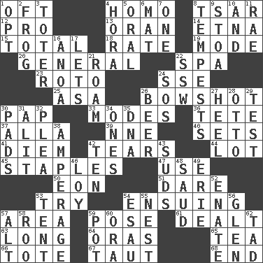 ACROSS 1. Often (poetically) 4. Like (prefix) 8. Russian ruler of old 12. Adept person 13. NW Algerian seaport 14. Inactive volcano in Sicily 15. "_____ Recall" 18. Assign a rank or rating to 19. Method 20. Commissioned military rank 22. Health resort 23. Printing process, for short 24. Compass dir. 25. White ___ sheet 26. The distance a bow sends an arrow 30. Infant food 33. Methods 36. Wig 37. Silent film actress Nazimova 39. Compass dir. 40. Puts into a specified state 41. South Vietnam president (1954) 42. Pulls into pieces 44. Car dealer's back yard 45. Paper fasteners 47. Purpose 50. A really long time 51. Have the gumption 53. Attempt 54. Taking place subsequently 57. Length times width 59. Introduce or present, as a question 61. Started a card game 63. Protracted 64. Mouths or openings 65. Beverage made from leaves 66. Haul 67. Tense 68. Conclusion DOWN 1. Elect 2. Toadlike animal 3. Carrier 4. Israeli folk dance 5. Of the mouth 6. Floor protector 7. Single 8. Storms 9. Portico 10. Added to 11. Actress Charlotte 16. Small Philippine buffalo 17. Allows 21. Wander 22. Compass dir. 24. Distress signal 26. Fermented drink made from hops 27. Person who is morally reprehensible 28. "Beetle Bailey" pooch 29. Trial 30. Writing tablets 31. Came down and settled, as after flight 32. Entreaty 34. Singles 35. Heredity factor (abbr.) 38. Electrical Measurement 42. Nine, plus one 43. Beer foam 46. Myrna of the movies 48. Saudi Arabian king (1953-1964) 49. 4th largest of the Great Lakes 52. Related on the mother's side 53. Portable shelter 54. Son of Isaac 55. Egg locale 56. Small, secluded valley 57. Keyboard modifier key 58. Friend of Pooh 59. Plant holder 60. Mouth or opening 62. Small boy