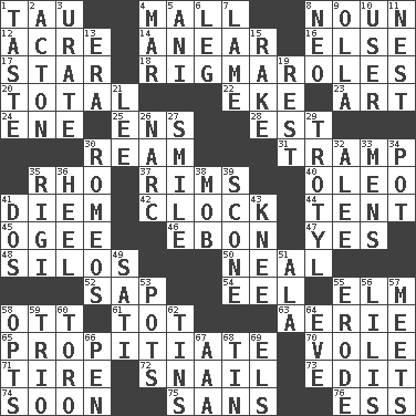 ACROSS 1. The 19th letter of the Greek alphabet 4. Promenade 8. Part of speech 12. Land measure 14. Approach 16. Otherwise 17. Play the lead 18. Frustrating wastes of time 20. "_____ Recall" 22. Supplement with great effort 23. Nonscientific branch of learning 24. Compass dir. 25. Followers of ems 28. Eastern Standard Time (abbr.) 30. 480, 500 or 516 sheets of paper 31. _____ steamer (cargo ship) 35. 17th letter of the Greek alphabet 37. Basketball hoops 40. Margarine 41. South Vietnam president (1954) 42. Timepiece 44. Portable shelter 45. Double curve, resembling the letter S 46. Inky black, to poets 47. Consenting reply 48. Grain storage towers 50. Be tempered by heat 52. Plant excrement 54. Snakelike fish 55. Shade tree 58. Baseball player Mel 61. Small child 63. Nest on high 65. Appease 70. Short-tailed, large-bodied rat 71. Become fatigued 72. Slow-paced one 73. Prepare for publication 74. Within a short period 75. Without 76. Double-curved letter DOWN 1. Clothes sense 2. 13-14th century defensive garment 3. A salt of uric acid 4. Third mo. 5. Black tropical American cuckoo 6. Part of a journey 7. Unable to walk 8. Modern: prefix 9. Water jar 10. One who makes use of a thing 11. Egg locale 13. Period 15. Immoral or dissolute person 19. Repose 21. Area sheltered from the wind 26. Drug cop 27. Grin 29. TNT 30. Lover boys 32. Toward shelter 33. Not women's 34. Cooking vessel 35. Swiss mountan, "Queen of the Mountains" 36. The bottom of a shoe or boot 38. Disorderly crowd 39. Biscuitlike quick bread 41. Two (Sp.) 43. Leg joint 49. Suttee (variant) 51. Chicken ___ king 53. Cooking vessels 55. Eat (away) 56. Ms. Damita and namesakes 57. Confronts 58. Chooses 59. Musical group of three 60. "Corrida" creature 62. Airtight sealed metal containers 64. First lady 66. Writing instrument 67. Auto club (abbr.) 68. Metal container 69. Raised railways