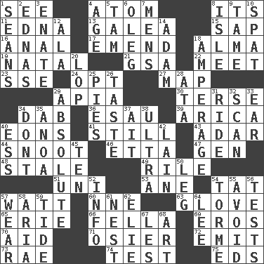 ACROSS 1. Observe 4. Tiny particle 8. It is 11. Pulitzer Prize-winning author Ferber 13. An organ shaped like a helmet 15. Plant excrement 16. Of or related to the anus 17. Make improvements or corrections to 18. _ mater 19. Relating to or accompanying birth 21. Girls' org. (abbr.) 22. Confront 23. Compass dir. 24. Choose 27. Atlas unit 29. Capital of Western Samoa 30. Laconic 34. Small moist lump or mass 36. He sold his birthright 39. N. Chile seaport 40. Immeasurably long periods of time 41. Free from disturbance or agitation 43. The sixth month of the Jewish calendar 44. Snout, nose 46. Singer James 47. Commissioned mil. rank 48. Lacking originality or spontaneity 49. Cause heat under the collar 51. Corn or form start 53. A saturated hydrocarbon 54. Make lace 57. Electrical Unit 60. Compass dir. 63. Michael Jackson trademark 65. 4th largest of the Great Lakes 66. Man or boy (slang) 69. Greek god of love 70. Help 71. Flexible twig of a willow tree 72. Send forth 73. Actress Charlotte 74. Trial 75. Begley and Asner DOWN 1. Actors Connery and Penn 2. Ferber et al. 3. Maternal 4. Ripen 5. Scottish cap 6. Cassini of fashion 7. Not women's 8. Capri or Wight 9. Not wild 10. Petty quarrel 12. According to 14. First of billions? 18. Electrical Measurement 20. Trim (branches) 25. Sliced desserts 26. Clothes sense 28. _ moment's notice (2 wds.) 29. Utter; complete 31. Travel on an animal 32. Examine minutely or intensely 33. Ewer handle 34. Do not 35. Small Philippine buffalo 37. Small island 38. Extreme 40. Double-curved letter 42. (Had) reclined 45. "___ Little Indians" 50. Part of a journey 52. A message received and understood 54. Singer Mel 55. Shun 56. Trials 57. Erode 58. Roberta Peters solo 59. Periodic rise and fall of the sea level 61. A home for chicks 62. Writer Wiesel 64. Area sheltered from the wind 67. French article 68. Tate display