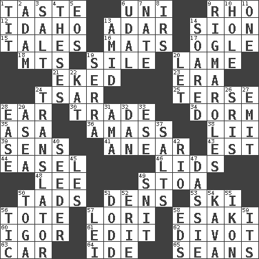 ACROSS 1. Clothes sense 6. University (slang) 9. 17th letter of the Greek alphabet 12. Potato state 13. The sixth month of the Jewish calendar 14. The Jewish people; Israel 15. Falsehoods 16. Floor coverings 17. Stare at amorously 18. Mountains (abbr.) 19. Filth; sediment 20. Unable to walk 21. Made supply last 23. Epoch 24. Russian ruler of old 25. Laconic 28. Hearing organ 30. Buy and sell 34. Dormintory (informal) 35. White ___ sheet 36. Collect or gather 38. Cards in a Roman deck? 39. Elected reps. 41. Approach 43. Eastern Standard Time (abbr.) 44. Artist's stand 46. Hats (slang) 48. Area sheltered from the wind 49. Portico 50. Bits 51. Cub Scout units 53. What Jean-Claude Killy likes to do 56. Haul 57. Australian parrot (variant) 58. 1973 Nobel Price Winner (Physics) Leo 60. Composer Stravinsky 61. Prepare for publication 62. A piece of turf (Scot.) 63. Automobile 64. Binary compound 65. Seines DOWN 1. Teat (slang) 2. First of billions? 3. Table seasoning 4. College papers 5. Greek goddess of the dawn 6. Freehold land 7. Nathan's nickname 8. Big collection agency 9. Frustrating wastes of time 10. Opening into or through something 11. Single 13. Among 14. Flew 19. Father Junipero _ 20. Allow 22. Krazy ___ of comics 24. Interpreter 26. Indian titles of respect 27. Give off 28. Comfort 29. Toward the sea 31. Nanny (var.) 32. One of the 12 tribes of Israel 33. Compass dir. 37. Table seasonings 40. Sowing specialist 42. River (Sp.) 45. French article 47. Hyrax 49. In a ____ (agitated or irritated) 50. Ancient Roman robe 51. Texas town _ City 52. One of the Great Lakes 54. Polynesian shrub of the pepper family 55. Picture 56. Nervous spasm 57. Luau accessory 58. Begley and Asner 59. ___ a Wonderful Life