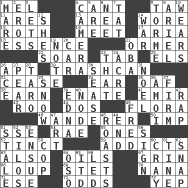 ACROSS 1. Cartoonist voice _ Blanc 4. Patter 8. The 23rd letter of the Hebrew alphabet 11. Ancient Greek god of war 13. Length times width 14. Had on 15. Writer of Portnoy's Complaint (1969) 16. Confront 17. Operatic vocal solo 18. Core 21. Abalone 22. Fly high 23. Keyboard key 25. Raised railways 26. Fitting 29. File 13 32. Stop 34. Ewer handle 35. Clumsy lout 38. Merit 39. Maternal 41. Arab leader 43. Friend of Pooh 44. Two (Sp.) 45. Plants 46. Roamer 50. Naughty child 51. Compass dir. 54. Actress Charlotte 55. Washington bills 57. Tinged 59. Inveterate users 63. In addition 64. Lubricates 67. Amused look 68. Central Nebraska county 69. Proofreading order 70. Grandmother 71. Compass dir. 72. Probability 73. Slangy assent DOWN 1. Female horse 2. Greek god of love 3. Allows 4. Device for capturing images 5. "We ___ not amused" (Victoria) 6. Born 7. Make lace 8. Singer Mel 9. Satellite of Uranus 10. Puts on (as clothing) 12. "______ My Girl" (Turtles hit) 14. Armed conflict 19. Make mention of 20. Automobile 21. Chief or king in Benin or Nigeria 23. Not this but _ 24. 43,560 square feet 26. Adept person 27. Lightbulb-shaped fruit 28. Edible starchy tuberous root 30. Gospel singer Marvin 31. Christmas carol 33. Overwhelm 36. Mine, in Marseilles 37. Unshakable 39. Pulitzer Prize-winning author Ferber 40. Connecting point 42. Reproach for some lapse or misdeed 45. Flintstone 47. Nonscientific branch of learning 48. Cooks with dry heat, as in an oven 49. Conclusion 51. Having lost freshness 52. Grain storage towers 53. Take place subsequently 56. Public display of a written message 58. Police officer (slang) 60. Supercomputer manufacturer 61. Prong on a fork 62. Fastener 64. Bear (Spanish) 65. It would 66. Directed