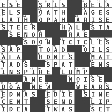ACROSS 1. Compass dir. 4. Indian titles of respect 8. Actor Lugosi 12. Raised railways 13. Pledge 14. Matures 15. Thin strip of wood or metal 17. Brightly colored fish 18. Ascend 19. Navigate 21. Actor Linden 23. R.R. building 24. Sir (Sp.) 26. Actress Charlotte 28. Within a short period 30. Winter's stalactites 34. Plant excrement 37. Frog relative 39. Lubricates 40. According to 41. Dwellings 43. Floor protector 44. Small amounts or degrees 46. Argument over a trivial matter 47. Followers of ems 48. Motivate 51. Mass 54. One (Scot) 55. Annoying sound 58. ___ good deed 61. ___ Haven, CT 63. Puts on (as clothing) 65. Ferber et al. 67. Singer Brickell 71. Trig term 72. Penny 73. Transmit 74. Mouth edge 75. The main thing one is thinking about 76. It was, poetically 77. Arrange properly for use DOWN 1. Snakelike fish 2. Narrow boards 3. First name in cosmetics 4. "Barney Miller" actor Jack 5. Hit sharply and swiftly 6. Call ___ day 7. Quiet! 8. Drinking establishment 9. The front part of a cuirass 10. For fear that 11. At sea 16. Coop moms 18. Jai ____ 20. Friend of Pooh 22. Curve 25. Writer of Portnoy's Complaint (1969) 27. Environmental prefix 29. Trap for birds or small mammals 30. Perfect 31. Citrus frut 32. Liveliness 33. Fast planes 34. Suttee (variant) 35. Actor Alda or Thicke 36. Groovy apts. 38. Electrical Unit 42. Surprise greatly 45. Health resort 49. Restaurants 50. To separate or throw off 52. Cut the grass 53. Sliced desserts 56. Moves on water 57. Bert's buddy 58. Tenth: prefix 59. Wrote a lyric poem 60. Singer Murray 62. 270 degrees 64. Back-to-school mo. 66. _ moment's notice (2 wds.) 68. Morning condensation 69. _ tizzy (2 wds.) 70. Begley and Asner