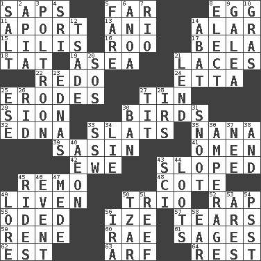 ACROSS 1. Plant excrements 5. Distant 8. Oval reproductive body of a fowl 11. To the left, to Queeg 13. Black tropical American cuckoo 14. Having or resembling wings 15. Ms. Damita and namesakes 16. Friend of Pooh 17. Actor Lugosi 18. Make lace 19. At sea 21. Shoestrings 22. Do over again 24. Singer James 25. Eats (away) 27. Metal container 29. The Jewish people; Israel 30. Avian creatures 32. Pulitzer Prize-winning author Ferber 33. Narrow boards 35. Grandmother 39. Indian antelope 41. Sign of something about to happen 42. She-sheep 43. Inclined 45. San ____ (Riviera town) 48. ____ d'Azur (French Riviera) 49. Make or become more lively 50. Musical group of three 52. Hit sharply and swiftly 55. Wrote a lyric poem 56. Ending with capital 57. Pulls apart 59. French philosopher Descartes 60. Actress Charlotte 61. Gurus 62. Eastern Standard Time (abbr.) 63. Sandy's bark 64. Remainder DOWN 1. Table seasoning 2. Capital of Western Samoa 3. Coward 4. Indian title of respect (Mr.) 5. Conductor's collection 6. Small Philippine buffalo 7. River (Sp.) 8. Opt 9. An organ shaped like a helmet 10. Pate de foie ____ 12. Sadhe (variant) 14. Blind as ____ 20. Distress signal 21. Grant temporary use of 23. Ferber et al. 25. Compass dir. 26. To free from 27. Teat (slang) 28. Big collection agency 30. Bar 31. Snout, nose 33. Compass dir. 34. Whopper 36. Electrical Measurement 37. Born 38. Also 40. A really long time 43. _-fi 44. Plunders 45. Amusement-park features 46. Incident 47. Ancient Persian 49. Old wives' tales, e.g. 50. Czar 51. Coral collection 53. Ancient Greek god of war 54. Inconspicuous attention getter 56. Retirement account (abbr.) 58. Hearing organ