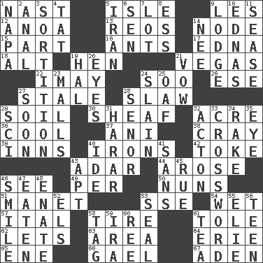 ACROSS 1. Political cartoonist Thomas 5. Capri or Wight 9. French article 12. Small Philippine buffalo 13. Vintage cars 14. Thickened enlargement 15. Role in a play 16. Pismires 17. Pulitzer Prize-winning author Ferber 18. The first octave above the treble staff 19. Layer 21. Viva Las _ 22. "If ____ say so..." 24. "Barney Miller" actor Jack 26. Compass dir. 27. Lacking originality or spontaneity 28. Cole _ (cabbage dish) 29. Earth 30. To gather and bind into a bundle 32. Land measure 36. Calm and collected 37. Black tropical American cuckoo 38. Supercomputer manufacturer 39. Restaurants 40. Metal shackles 42. Casino tip 43. The sixth month of the Jewish calendar 44. Came up 46. Observe 49. For each 50. Religious women 51. French painter Edouard 53. Compass dir. 54. Soggy 57. Slanted text style (abbr.) 58. Become fatigued 61. Lacquered or enameled metalware 62. Allows 63. Type of rug 64. One of the Great Lakes 65. Compass dir. 66. Highlander 67. An important port of Yemen DOWN 1. California wine valley 2. Of or related to the anus 3. Conclusion 4. Make lace 5. SW Asia republic 6. Elected rep. 7. Car dealer's back yard 8. Curvy letter 9. Cabin 10. Ferber et al. 11. Gospel singer Marvin 14. Born 19. Actor Linden 20. Sight organs 21. Solemn pledge 23. Promenades 24. Killed 25. Clumsy lout 27. Within a short period 28. Sir (Sp.) 29. _-fi 31. Ethiopian city, capital of Harari 32. Gambison 33. What you're doing now 34. Libertine 35. Sight organ 40. Binary compound 41. Without 43. Fitting 45. Regret 46. Grin 47. Eroded 48. Related on the mother's side 52. Raised railways 53. Lick closed 55. Writer Wiesel 56. Adolescent 58. Label 59. Retirement account (abbr.) 60. To separate or throw off 61. Afternoon social gathering