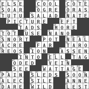 ACROSS 1. Otherwise 5. Calm and collected 9. ____ d'Azur (French Riviera) 13. Fly high 14. Legendary monster 15. Mouths or openings 16. Ballerina skirt 17. Vegetable dish 18. Nathan's nickname 19. Photo 21. Bank Draft (abbr.) 22. Small amounts or degrees 23. Greater amount 24. Small child 27. Purpose 28. Billionth: prefix 29. Derisive sound 31. Plant holder 32. Be tempered by heat 36. Measure of real estate 37. Distant 38. Pacific island yam 39. Vintage cars 40. Electrically charged atom 41. NE Netherlands city 42. To the inside or interior of 44. Pipe bend 46. Label 47. Wrote a lyric poem 48. Distinctive style or manner 50. Perceive with the eye 51. Electrical Measurement 54. Ache 56. Bobsleighs 58. Within a short period 60. Actor Baldwin 61. Filth; sediment 62. Singer Murray 63. Have the gumption 64. Uncontrolled 65. For fear that DOWN 1. Eastern Standard Time (abbr.) 2. Central Nebraska county 3. Suttee (variant) 4. Spew [out] 5. Rough 6. Stare 7. Mouth or opening 8. Directed 9. Meets 10. Declaim 11. Make lace 12. Compass dir. 17. Soap bubbles 20. Drawn tight 21. Period of immesurable duration 23. Floor protector 24. Russian ruler of old 25. At one time in the past 26. "Corrida" creature 28. And not 30. Home 31. Baking dish 33. 90 degrees 34. Length times width 35. Having great length 37. Egg _ yung 40. It would 41. Set down 43. Born 44. Dodged 45. Allows 47. Flexible twig of a willow tree 49. Rhinal 51. Water source 52. Went 53. Immeasurably long periods of time 54. Groovy apt. 55. Chicken ___ king 56. Compass dir. 57. Cards in a Roman deck? 59. Fish or hair follower