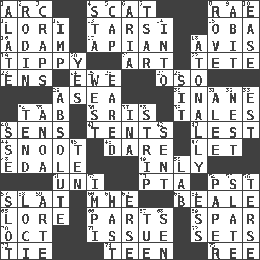 ACROSS 1. Curve 4. Scram! 8. Actress Charlotte 11. Australian parrot (variant) 13. Tarsus (plural) 15. Chief or king in Benin or Nigeria 16. First of billions? 17. Bee-related 18. Opinion 19. Likely to tip or tilt 21. Tate display 22. False hair 23. Followers of ems 24. She-sheep 27. Bear (Spanish) 29. At sea 30. Lacking in sense or substance 34. Bar bill 36. Indian titles of respect 39. Stories 40. Elected reps. 41. Portable shelters 43. For fear that 44. Snob 46. Have the gumption 47. Allow 48. Peak District village in England 49. In an inward manner 51. University (slang) 53. Parent Teacher Association (abbr.) 54. Pacific Standard Time (abbr.) 57. Narrow board 60. Madame (abbr.) 63. Memphis, Tenn. Street 65. Old wives' tales, e.g. 66. Actors' quests 69. Practice fight 70. Sep. follower 71. Come out of 72. Arranges properly for use 73. Standoff 74. Adolescent 75. To riddle DOWN 1. Having winglike extensions 2. "The Thinker" sculptor 3. Dice game 4. R.R. building 5. Head covering 6. Operatic vocal solo 7. Russian ruler of old 8. Be footloose 9. "This won't hurt ____!" 10. Relaxation 12. Naughty child 14. To the inside or interior of 18. Without tonality 20. Consenting reply 25. Compass direction 26. Having ears or earlike features 28. Be seated 29. Utter; complete 31. Toward shelter 32. Egg locale 33. Eastern Standard Time (abbr.) 34. Look after 35. Small Philippine buffalo 37. _ tizzy (2 wds.) 38. Long narrow piece of something 40. Compass dir. 42. Transmitted 45. Nine, plus one 50. Experiment locale 52. Body of Kaffir warriors 54. Some stationery 55. Chalkboard 56. Laconic 57. Slit 58. Locales 59. Johnson of "Laugh-In" 61. Vertical spar for supporting sails 62. Celtic language 64. Double-curved letter 67. Third day of the wk. 68. Elected rep.