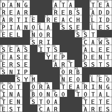 ACROSS 1. Mild oath, euphamism for damn 5. "One Day ___ Time" 8. Afternoon social gathering 11. Tail end 12. Confederate soldiers (slang) 14. Increase 15. Nick name for Arthur 17. Arrive at 18. Hat (slang) 19. Player piano 21. Compass dir. 22. French article 23. Snakelike fish 24. And not 25. Fast jet (abbr.) 27. Indian title of respect (Mr.) 28. Crow sounds 31. Oceans 35. ___ a Wonderful Life 37. Toward shelter 38. Comfort 39. Slangy assent 41. Gouge 42. Celtic language 43. Nonscientific branch of learning 45. Fast planes 46. Sever or remove by pinching or nipping 47. Globe 49. Symbol (abbr.) 51. Modern: prefix 52. Lion 55. Small bed 57. Mouth or opening 60. Lacerating 62. _ tizzy (2 wds.) 63. Beat drum 65. Add up to 66. Nine, plus one 67. Portico 68. Wig 69. Eastern Standard Time (abbr.) 70. 4-wheeled motor vehicle 71. Ancient Greek god of war DOWN 1. Window treatment 2. Nest on high 3. Relating to or accompanying birth 4. Smile widely 5. "We ___ not amused" (Victoria) 6. Beverages made from leaves 7. Lettered men learn these first 8. Baron Munchausen's specialties 9. Singer Brickell 10. Sums up 13. "______ My Girl" (Turtles hit) 16. Immeasurably long periods of time 17. Noteworthy scarcity 20. Australian parrot (variant) 26. Heaps 29. Left 30. Puts into a specified state 31. Perceives with the eye 32. Merit 33. Aide 34. Not well drained, as in land 36. Ocean 40. Right away 44. Woody plant 48. Water vessel 50. Disorderly crowds 52. 61 cubic inches 53. Related on the mother's side 54. Stares 55. Quote 56. Washington bills 58. College mil. group 59. Small Philippine buffalo 61. Round or rotation of duties 64. Slender fish