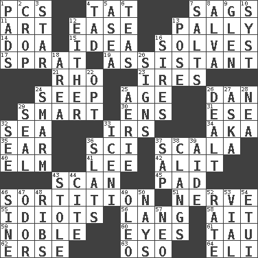 ACROSS 1. Personal Computers (abbr.) 4. Make lace 7. Sinks 11. Nonscientific branch of learning 12. Comfort 13. Chummy 14. ___ good deed 15. The content of cognition 16. Finds the solution 17. Small fatty European fish 19. Aide 21. 17th letter of the Greek alphabet 23. Angers 24. Ooze 25. Mature 26. Daniel's nick name 29. Don Adams' spy role 30. Followers of ems 31. Compass dir. 32. Ocean 33. Big collection agency 34. Alias (abbr.) 35. Ewer handle 36. _-fi 37. Any of the three canals of the cochlea 40. Shade tree 41. Area sheltered from the wind 42. Came down and settled, as after flight 43. Glance over 45. Groovy apt. 46. Determination 51. Boldness 55. Foolish or stupid persons 56. Long (Scottish) 58. Small island 59. Impressive in appearance 60. Snake ____ (dice throw) 61. The 19th letter of the Greek alphabet 62. Celtic language 63. Bear (Spanish) 64. Connecticut Ivy Leaguer DOWN 1. Writing tablets 2. Riding implement 3. Play the lead 4. Small boy 5. Toward the sea 6. Beverages made from leaves 7. Table seasonings 8. Inventor's middle name 9. Small, secluded valley 10. System (abbr.) 12. One or the other 13. Airs 16. Male parents of animals 18. Length times width 20. Omens 22. Elect 24. Excessive but superficial compliments 25. Nest on high 26. Started a card game 27. "____ silly question..." 28. Teachers' org. 29. Lick closed 32. Observe 33. Ancient Celtic tribe of eastern Britain 36. Narrow boards 37. Plant excrement 38. Rings like a ship's bell 39. Assistant 43. Fur scarf 44. Quote 46. Trig term 47. Scent 48. Teases 49. Margarine 50. Negative votes 52. Pace 53. Small bottle 54. Needle holder 57. Modern: prefix