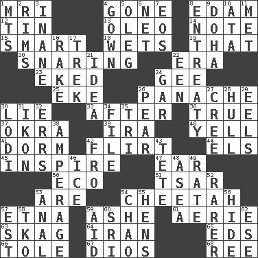 ACROSS 1. Medical imaging device (abbr.) 4. Went 8. Dutch treat 12. Shallow baking pan 13. Margarine 14. Observe 15. Don Adams' spy role 18. Moistens 19. Not this but _ 20. Catching in a trap 22. Epoch 23. Made supply last 24. Unit of force equal to gravity 25. Supplement with great effort 26. Flamboyance 30. Falsehood 33. Following 36. Loyal 37. Gumbo ingredient 39. Retirement account (abbr.) 40. Shout 41. Dormintory (informal) 42. Seductive woman who exploits men 44. Raised railways 45. Stimulate to action 47. Hearing organ 50. Environmental prefix 51. Russian ruler of old 53. "We ___ not amused" (Victoria) 54. Leopard's kin 57. Inactive volcano in Sicily 59. American tennis player Robert 61. Nest on high 63. Heroin 64. SW Asia republic 65. Begley and Asner 66. Lacquered or enameled metalware 67. "Vaya con ____" 68. To sift DOWN 1. Mountains (abbr.) 2. Basketball hoops 3. Empty; void 4. Woman's formal wear 5. Cassini of fashion 6. Remaining after all deductions 7. Greek goddess of the dawn 8. Plea 9. Capital of the state of Qatar 10. _ moment's notice (2 wds.) 11. Was introduced to 16. Immoral or dissolute person 17. Long journey 21. The content of cognition 22. Car or cant ending 24. Slender fish 26. Lightbulb-shaped fruit 27. Algonquian 28. Frame or body of a ship 29. Snakelike fish 30. Farming town in central California 31. Image 32. Blunders 34. Do some clerical work 35. Three (prefix) 38. Electrical Measurement 42. From 43. Wig 46. Frozen water 48. At sea 49. Pace 52. Less widely known 53. Of or related to the anus 54. US Secretary of Labor Elaine L. _ 55. Coop moms 56. Flintstone garb 57. Eastern Standard Time (abbr.) 58. Ring climax 59. Help 60. Indian title of respect (Mr.) 62. Compass dir.