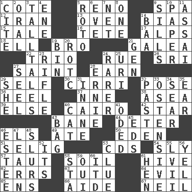 ACROSS 1. ____ d'Azur (French Riviera) 5. Former U.S. Attorney General Janet 9. Health resort 12. SW Asia republic 13. Baking chamber 14. Prejudice 15. Falsehood 16. False hair 17. High mountains 18. Pipe bend 19. Sis' sibling 21. An organ shaped like a helmet 22. Musical group of three 24. Sorrow 26. _ Lanka 27. Virtuous person 28. Merit 29. Automatic 30. High-altitude cloud 32. Introduce or present, as a question 36. The bottom of a shoe or boot 37. Compass dir. 38. At sea 39. Otherwise 40. Capital of Egypt 42. Play the lead 43. Object of repulsion 44. Prevent from occurring 46. Raised railways 49. Had dinner 50. Locale of original sin 51. Major League Baseball Commissioner Bud 53. Music discs 54. Playfully artful 57. Tense 58. Land 61. Hub of activity 62. Blunders 63. Ballerina skirt 64. Morally bad or wrong 65. Followers of ems 66. Helper 67. Famous astronaut Armstrong DOWN 1. Quote 2. Of the mouth 3. Baron Munchausen's specialties 4. Compass dir. 5. Printing process, for short 6. First lady 7. Remaining after all deductions 8. Single 9. Beverly of Met fame 10. Some stationery 11. Slender Brazilian palm 14. Sound made by sheep 19. Storage container 20. College mil. group 21. Commissioned military rank (abbr.) 23. Firearm 24. More valued for its uncommonness 25. RI univ. 27. Stitch closed the eyes of (a falcon) 28. Bert's buddy 29. A female animal or person 31. Lacking in sense or substance 32. Thick mixture 33. Clearly or manifestly demonstrative 34. Singe 35. Ewer handle 40. Feline 41. Wrote a lyric poem 43. Container for groceries 45. Begley and Asner 46. First name in cosmetics 47. Acquire or gain knowledge or skills 48. Disparaging remarks 52. ___ a Wonderful Life 53. A slight indication 55. 57 in ancient Rome 56. Shout 58. R.R. building 59. Fr. "Yes" 60. It would 61. Layer