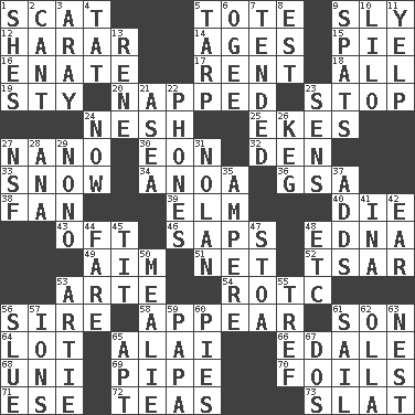 ACROSS 1. Scram! 5. Carry 9. Cunning 12. Ethiopian city, capital of Harari 14. Ripens 15. Sliced dessert 16. Maternal 17. Monthly bill 18. Everything 19. Filthy place 20. Slept 23. Obstruct or block passage 24. Delicate 25. Supplements with great effort 27. Billionth: prefix 30. Period of immesurable duration 32. Lair 33. Frozen precipitation 34. Small Philippine buffalo 36. Girls' org. (abbr.) 38. Avid follower 39. Shade tree 40. Pass on 43. Often (poetically) 46. Plant excrements 48. Pulitzer Prize-winning author Ferber 49. Direct toward a target or goal 51. Fish or hair follower 52. Russian ruler of old 53. Johnson of "Laugh-In" 54. College mil. group 56. Male parent of an animal 58. Seem 61. Boy, to dad 64. Car dealer's back yard 65. Jai _ 66. Peak District village in England 68. University (slang) 69. Corncob 70. Fencing necessities 71. Compass dir. 72. Beverages made from leaves 73. Narrow board DOWN 1. "______ My Girl" (Turtles hit) 2. Patter 3. Like ___ of sunshine 4. Make lace 5. Canvas cover 6. Double curve, resembling the letter S 7. Looked after 8. Eastern Standard Time (abbr.) 9. Arguments over trivial matters 10. _ and Stitch 11. Sharp bark 13. French philosopher Descartes 21. Toward the sea 22. Gives a jingle 23. Elected reps. 24. At this time 26. Barrel 27. Science/research agcy. 28. Santa ___, CA 29. Words to Nanette 31. Pitcher Ryan 35. Electrical Unit 37. Does sums 41. _ tizzy (2 wds.) 42. Hearing organ 44. Conductor's collection 45. Teat (slang) 47. Portico 48. And so on (abbr.) 50. Ear of corn 53. Nick name for Arthur 55. Not kosher 56. Change direction abruptly 57. Charged atoms 59. Dad 60. Sliced desserts 61. Move on water 62. Spanish pot 63. A home for chicks 65. Fitting 67. Two (Sp.)