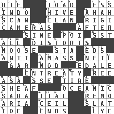 ACROSS 1. Expire 4. Frog relative 8. Curvy letter 11. _ china 13. Hub of activity 14. Nanny 15. Skim 16. Flair 17. Swiss mountan, "Queen of the Mountains" 18. Devices for capturing images 21. Following 22. Trig term 23. Luau course 25. Fast jet (abbr.) 26. 100% 29. What propaganda does 32. Trap for birds or small mammals 34. R.R. building 35. Begley and Asner 38. Opposed to 39. Collect or gather 41. Famous astronaut Armstrong 43. Slender fish 44. Allow head to fall sleepily 45. Peak District village in England 46. Plea 50. To sift 51. White ___ sheet 54. Compass dir. 55. Hoop that covers a wheel 57. Archer's quiver 59. Pertaining to the sea 63. "Two Mules for Sister ____" 64. Slanted text style (abbr.) 67. San ____ (Riviera town) 68. Roberta Peters solo 69. To provide with a ceiling 70. Narrow board 71. Binary compound 72. Extremities 73. Sodium hydroxide DOWN 1. Plate 2. South American Indian 3. Dutch treat 4. College papers 5. Petroleum 6. Actress Gardner 7. Lair 8. Gives off 9. Gurus 10. Upper-body garment 12. Singles 14. Sandy's bark 19. Travel on or in a vehicle 20. Black tropical American cuckoo 21. Small island 23. Plant holders 24. Mouths or openings 26. Santa ___, CA 27. Protracted 28. Globular water bottle used in Asia 30. Sadhe (variant) 31. Transmit 33. Title for a man of rank and authority 36. Letter starter 37. Filth; sediment 39. Pismires 40. Greater amount 42. Area sheltered from the wind 45. Jane of fiction 47. Overdraft (abbr.) 48. Ringlike coral islands and reefs 49. Nervous spasm 51. Slender Brazilian palm 52. Broken piece 53. Nest on high 56. Hearing organs 58. Auto club (abbr.) 60. 1994 drama film starring Jodie Foster 61. "If ____ say so..." 62. ____ d'Azur (French Riviera) 64. Frozen water 65. Nine, plus one 66. Assist