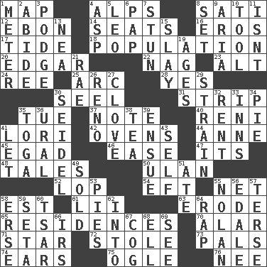 ACROSS 1. Atlas unit 4. High mountains 8. Suttee (variant) 12. Inky black, to poets 14. Theater features 16. Greek god of love 17. Periodic rise and fall of the sea level 18. Census information 20. _ Allan Poe 22. Tired old horse 23. The first octave above the treble staff 24. To riddle 25. Curve 28. Consenting reply 30. Sew up the eyelids of hawks and falcons 31. Empty completely 35. Third day of the wk. 37. Short letter 40. Painter Guido (1575-1642) 41. Australian parrot (variant) 42. Baking chambers 44. Singer Murray 45. Mild oath 46. Relaxation 47. It is 48. Falsehoods 50. ____ Bator, Mongolia 52. Trim (branches) 54. Lizard (obsolete) 55. Fish or hair follower 58. Eastern Standard Time (abbr.) 61. Cards in a Roman deck? 63. Eat (away) 65. Homes 70. Having or resembling wings 71. Play the lead 72. Took without asking 73. Friends 74. Hearing organs 75. Stare 76. Born DOWN 1. Distance measurement 2. Stay 3. Porridge 4. Cleo's killer 5. Lion 6. Infant food 7. Surprise greatly 8. Arrange properly for use 9. Roberta Peters solo 10. Implement 11. Is not 13. Teachers' org. 15. Kill 19. Grows older 21. Actress Charlotte 26. Former U.S. Attorney General Janet 27. Garlic unit 29. Put through a sieve 30. A glass for beer 32. Monthly bill 33. Lodging establishments 34. Sliced dessert 35. Ancient Roman robe 36. Mountain range 38. Beverage made from leaves 39. Follow as a consequence or result 41. Allow 43. Automatic 49. Disposed of to a purchaser 51. Had dinner 53. Sliced desserts 55. Pitcher Ryan 56. Peak District village in England 57. Laconic 58. Celtic language 59. Bristle 60. Russian ruler of old 62. To the inside or interior of 64. Hit sharply and swiftly 66. Big collection agency 67. Gear tooth 68. Pipe bend 69. Perceive with the eye