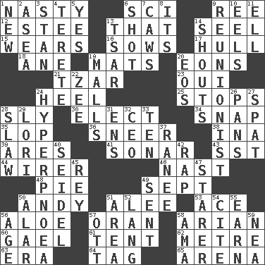 ACROSS 1. Offensive 6. _-fi 9. To riddle 12. First name in cosmetics 13. Not this but _ 14. Stitch closed the eyes of (a falcon) 15. Erodes 16. Sty mamas 17. Frame or body of a ship 18. One (Scot) 19. Floor protectors 20. Immeasurably long periods of time 21. Czar 23. Fr. "Yes" 24. The bottom of a shoe or boot 25. Halts 28. Roguish 30. Opt 34. Fastener 35. Trim (branches) 36. Scornful expression 38. _ tizzy (2 wds.) 39. Ancient Greek god of war 41. Underwater navigation system 43. Fast jet (abbr.) 44. One who wires 46. Political cartoonist Thomas 48. Sliced dessert 49. Back-to-school mo. 50. "60 Minutes" Commentator Rooney 51. Toward shelter 53. Adept person 56. _ vera 57. Northwest Algerian city 58. Believer in; advocate of (suffix) 60. Highlander 61. Portable shelter 62. Distance measurement (Brit.) 63. Epoch 64. Label 65. Sports stadium DOWN 1. ___ Haven, CT 2. Toward the sea 3. Comedian Laurel of Laurel & Hardy 4. Cylindrical with tapered ends 5. Affirmative reply 6. Went for two points 7. Crow sounds 8. It is 9. One who advocates reunion 10. Snakelike fish 11. Pipe bend 13. Russian ruler of old 14. Yells 19. Shopping centers 20. Greek goddess of the dawn 22. Last letter of the English alphabet 24. Abnormally rapid or deep breathing 26. Baking dishes 27. Argument over a trivial matter 28. Cole _ (cabbage dish) 29. Australian parrot (variant) 31. Followers of ems 32. Corporate head (abbr.) 33. Nine, plus one 37. The wife of a rajah (variant) 40. Beer mug 42. Strike 45. Marina Del _, California 47. A viewer who gazes fixedly 49. Posted 50. Having or resembling wings 51. Type of rug 52. Long (Scottish) 54. Quote 55. Merit 56. Grow older 57. Baseball player Mel 58. Wet nurse (var.) 59. Teachers' org.