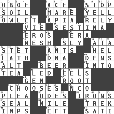 ACROSS 1. Mitch Miller's instrument 5. Adept person 8. Cease 12. The visible part of the earth's surface 13. Female horse 15. Shout 16. A small or young owl 18. Capital of Western Samoa 19. Have trust in 20. Compete 22. French poetic form 24. Greek god of love 26. Period 27. Delicate 28. Mischievous 29. _ moment's notice (2 wds.) 32. Proofreading order 35. Pismires 37. Cartoonist voice _ Blanc 38. Thin strip of wood or metal 39. Heredity factor (abbr.) 40. Habitations of wild animals 41. The first octave above the treble staff 42. Fermented drink made from hops 43. To the inside or interior of 44. Beverage made from leaves 45. Directed 46. Snakelike fish 49. Commissioned military rank (abbr.) 50. Carrot, for example 51. Opts 55. Non-commissioned officer (abbr.) 56. Entreaty 57. Lyric poems 59. Metal shackles 63. Lick closed 64. Mediterranean tributary 65. Long journey 66. Naughty children 67. Newt 68. Suttee (variant) DOWN 1. Bear (Spanish) 2. Ribbon knot 3. Lubricate 4. Veterans Day date 5. Wet nurse (var.) 6. Balmoral and tarboosh 7. One of the Great Lakes 8. Damascus' land 9. Adolescent 10. Rounded earthenware pot or jar 11. Strand of rope, yarn or thread 14. Artist's stands 17. Become fatigued 21. Greek goddess of the dawn 23. Attempt 25. Cast a shadow over 28. A viewer who gazes fixedly 29. So be it 30. Portable shelter 31. In addition 32. Narrow board 33. Falsehood 34. Singer James 36. Compass dir. 40. What propaganda does 42. Gillaume's butler role 45. Lion 47. Period of immesurable duration 48. Event scenes 49. Scores awarded for successful feats 51. Clement's nick name 52. Pile 53. Singer Brickell 54. Automatically 56. 23rd letter of the Greek alphabet 58. Arrange properly for use 60. Mouth or opening 61. Remaining after all deductions 62. What Jean-Claude Killy likes to do