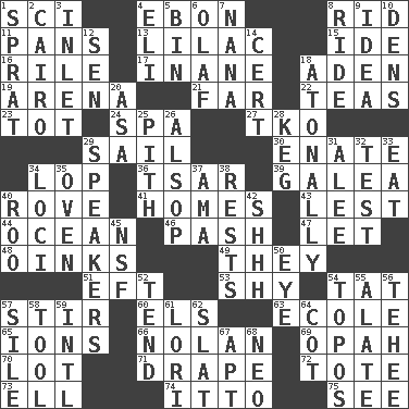 ACROSS 1. _-fi 4. Inky black, to poets 8. To free from 11. Baking dishes 13. Pale purple color 15. Binary compound 16. Cause heat under the collar 17. Empty; void 18. Arabian gulf 19. Sports stadium 21. At a great distance 22. Afternoon social gatherings 23. Small child 24. Health resort 27. Ring climax 29. Move on water 30. Related on the mother's side 34. Trim (branches) 36. Russian ruler of old 39. An organ shaped like a helmet 40. Be footloose 41. Residences 43. For fear that 44. Sea 46. Romantic infatuation 47. Allow 48. Pig sounds 49. Those people 51. Lizard (obsolete) 53. Like a shrinking violet 54. Make lace 57. Agitate 60. Raised railways 63. Learning spot: Fr. 65. Charged atoms 66. Pitcher Ryan 69. Brightly colored fish 70. Car dealer's back yard 71. Window treatment 72. Lug 73. Pipe bend 74. "Tell ____ the Marines!" 75. Perceive with the eye DOWN 1. Small fatty European fish 2. Capital of Egypt 3. An arm off of a larger body of water 4. Connecticut Ivy Leaguer 5. Storage container 6. Norwegian king 7. Nanny 8. Travel on an animal 9. It may be bright or harebrained 10. Lairs 12. Elected rep. 14. Certainty 18. Without tonality 20. White ___ sheet 25. Heart or essence 26. Columnist Joseph or Stewart 28. Cask 29. Orators 31. Toward shelter 32. Trial 33. Consume 34. Locales 35. Baking chamber 37. Housemaid (var.) 38. Musical pauses 40. Friend of Pooh 42. Quiet! 45. Science/research agcy. 50. Sight organ 52. Look after 54. Traditional theme or motif 55. Having winglike extensions 56. Giggle 57. Filth; sediment 58. Implement 59. International (abbr.) 61. Australian parrot (variant) 62. Narrow board 64. Small bed 67. Fitting 68. Modern: prefix