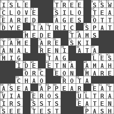 ACROSS 1. Capri or Wight 5. Relationship diagram 9. Compass dir. 12. Garlic unit 14. Grain storage tower 15. Beverage made from leaves 16. Having ears or earlike features 17. Grows older 18. Baseball player Mel 19. Color 20. Of or pertaining to medicine 23. Argument over a trivial matter 24. Ancient Persian 25. Scottish caps 27. Not wild 30. "We ___ not amused" (Victoria) 32. What Jean-Claude Killy likes to do 33. Of or related to the anus 34. Painter Guido (1575-1642) 36. _ moment's notice (2 wds.) 38. Russian fighter aircraft 39. Label 40. French article 43. Binary compound 46. Inactive volcano in Sicily 48. Nanny 49. The grampus (Milton) 51. A really long time 52. Female horse 53. US Secretary of Labor Elaine L. _ 54. Round or rotation of duties 56. Toward the sea 58. Seem 61. Erode 64. By way of 65. Greek god of love 66. Extremist 68. Big collection agency 69. Fast planes 70. Ingested 71. Observe 72. Trial 73. Romantic infatuation DOWN 1. On the rocks 2. Kill 3. Old wives' tales, e.g. 4. Night before a holiday 5. Russian ruler of old 6. Swiss mountan, "Queen of the Mountains" 7. Chooses 8. Greek goddess of the dawn 9. Discontinues 10. Bristle 11. Electrical Unit 13. Singer Brickell 21. The sixth month of the Jewish calendar 22. Cylindrical with tapered ends 23. Stricken, poetically 24. Cartoonist voice _ Blanc 26. Alias (abbr.) 27. Scottish cap 28. Black tropical American cuckoo 29. Wise men 31. Related on the mother's side 35. Refuse to acknowledge 37. _ mater 41. Hearing organ 42. A female animal or person 44. Capital of the state of Qatar 45. Period 47. Small Philippine buffalo 48. Wet nurse (var.) 50. Unrefined 53. Desist 55. Loyal 56. Deliberation 57. Father 59. Plant holders 60. Inconspicuous attention getter 61. Singer James 62. Ancient Greek god of war 63. Hyperbolic tangent 65. Eastern Standard Time (abbr.) 67. Pet locale
