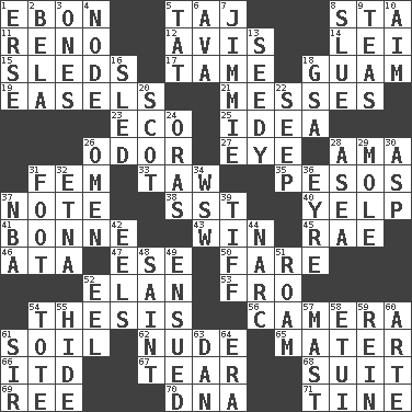 ACROSS 1. Inky black, to poets 5. _ Mahal 8. R.R. building 11. Former U.S. Attorney General Janet 12. Advice 14. Luau accessory 15. Bobsleighs 17. Not wild 18. Island territory of the United States 19. Artist's stands 21. Makes clutter 23. Environmental prefix 25. The content of cognition 26. Scent 27. Sight organ 28. Wet nurse (var.) 31. Opposite of masc. 33. The 23rd letter of the Hebrew alphabet 35. Mexican monetary units 37. Short letter 38. Fast jet (abbr.) 40. Sharp bark 41. Child's nurse 43. Acquire through effort 45. Actress Charlotte 46. "One Day ___ Time" 47. Compass dir. 50. Conductor's collection 52. Flair 53. Back 54. College paper 56. Device for capturing images 61. Earth 62. Naked 65. Mother 66. It would 67. Rend 68. Set or collection 69. To sift 70. Heredity factor (abbr.) 71. Prong on a fork DOWN 1. Celtic language 2. Actor Lugosi 3. Washington bills 4. Connecting point 5. Make lace 6. Actress Gardner 7. Stevie Ray Vaughan's brother 8. Change direction abruptly 9. Afternoon social gatherings 10. Direct toward a target or goal 13. Sleazy 16. Downhill vehicle 18. Girls' org. (abbr.) 20. Native of Scotland 22. Ooze 24. Mouths or openings 26. Sign of things to come 28. At sea 29. Undercover agent 30. Cleo's killer 31. One third of a yard 32. Inactive volcano in Sicily 34. Compass dir. 36. Jane of fiction 37. Basketball assoc. 39. Small quarrel 42. Snakelike fish 44. Drug cop 48. Virtuous person 49. Followed as a consequence or result 51. Wander 52. Snakelike fish 54. Carry 55. Flintstone garb 57. Vertical spar for supporting sails 58. Needle case 59. It's straight from the horse's mouth 60. Johnson of "Laugh-In" 61. Title for a knight 63. One of the 12 tribes of Israel 64. Epoch