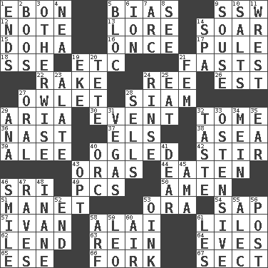 ACROSS 1. Inky black, to poets 5. Prejudice 9. Compass dir. 12. Short letter 13. Old wives' tales, e.g. 14. Fly high 15. Capital of the state of Qatar 16. Single time 17. Whine 18. Compass dir. 19. And so on (abbr.) 21. Goes without food and/or water 22. Libertine 24. To sift 26. Eastern Standard Time (abbr.) 27. A small or young owl 28. Thailand, formerly 29. Roberta Peters solo 30. Incident 32. Heavy book 36. Political cartoonist Thomas 37. Raised railways 38. Toward the sea 39. Toward shelter 40. Stared at amorously 42. Move through with a circular motion 43. Mouths or openings 44. Eroded 46. _ Lanka 49. Personal Computers (abbr.) 50. So be it 51. French painter Edouard 53. Mouth or opening 54. Plant excrement 57. "Terrible" tsar 58. Jai _ 61. _ and Stitch 62. Grant temporary use of 63. It's straight from the horse's mouth 64. Nights before holidays 65. Compass dir. 66. Tined utensil 67. Religious group DOWN 1. Extremities 2. Expressions of contempt or scorn 3. Else 4. Teachers' org. 5. Alliance 6. Electrically charged atom 7. Curve 8. Observe 9. Lush 10. Table seasonings 11. Take or capture by force 14. Health resort 19. Supplement with great effort 20. Wig 21. Opposite of masc. 23. Having winglike extensions 24. Wash lightly 25. Erode 27. Spoken 28. Makes a sale 29. Santa ___, CA 31. Viva Las _ 32. Clothes sense 33. Clearly or manifestly demonstrative 34. Chow _ 35. Ewer handle 40. The grampus (Milton) 41. Letter starter 43. Elect 45. Housemaid (var.) 46. Grin 47. All-night dance parties 48. Empty; void 52. Conclude 53. Pig sound 55. Actor Baldwin 56. Mail 58. Sandy's bark 59. Lion 60. Wind 61. French article