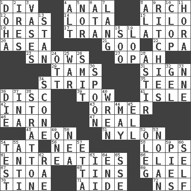 ACROSS 1. HTML Container Element 4. Of or related to the anus 8. Bowlike part 12. Mouths or openings 14. Globular water bottle used in Asia 15. _ and Stitch 16. Behest 17. Interpreter 20. At sea 21. Thick or sticky substance 22. Accounting whiz (abbr.) 23. Overwhelms 27. Brightly colored fish 29. Scottish caps 31. Public display of a written message 34. Long narrow piece of something 35. Adolescent 36. Flat circle 39. Pull behind 41. Small island 42. To the inside or interior of 43. Abalone 46. Merit 47. Actress Patricia 48. Period of immesurable duration 51. High-strength synthetic material 54. Make lace 56. Born 58. Chops off 61. Pleas 66. Writer Wiesel 67. Portico 68. Airtight sealed metal containers 69. Highlander 70. Prong on a fork 71. Helper 72. Science/research agcy. DOWN 1. Capital of the state of Qatar 2. Angers 3. Flower holders 4. Keyboard modifier key 5. And not 6. "One Day ___ Time" 7. Austrian-born American filmmaker Fritz 8. Insect wing 9. Actors Guy, Robert Welles, and Clint 10. Hoof sound 11. Israeli folk dance 13. Comedian Laurel of Laurel & Hardy 18. "Barney Miller" actor Jack 19. Trim (branches) 24. Baseball player Mel 25. Armed conflict 26. Stricken, poetically 28. Moving about 30. Soup utensil 32. Set 33. Compass dir. 34. Biscuitlike quick bread 36. Expire 37. _ tizzy (2 wds.) 38. Ski resort town in Vermont 40. Songbird 44. Can I? 45. Pipe bend 49. Single 50. Teachers' org. 52. Cassini of fashion 53. Pitcher Ryan 54. Trial 55. Opposed to 57. Singer James 59. Sliced desserts 60. Automatically 62. Actress Charlotte 63. One more than two 64. Conclusion 65. Compass dir.