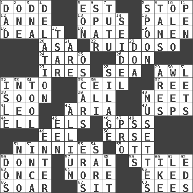 ACROSS 1. Texas town _ City 5. Eastern Standard Time (abbr.) 8. Obstruct or block passage 12. Queen of England 1702-14 13. Musical composition 15. Light colored 16. Started a card game 18. Nathan's nickname 19. Presage 20. White ___ sheet 22. Noisy, rowdy, vocal (Spanish) 24. Pacific island yam 26. Spanish title 27. Angers 28. Ocean 29. Leather borer 32. To the inside or interior of 35. To provide with a ceiling 37. To separate or throw off 38. Within a short period 39. 100% 40. Rendezvous 41. Lion 42. Roberta Peters solo 43. United States Postal Service (abbr.) 44. Pipe bend 45. Raised railways 46. Global Positioning Systems (abbr.) 49. Snakelike fish 50. Celtic language 51. Fools 55. Baseball player Mel 56. Do not 57. Mountain range 59. Vertical member of a panel or frame 63. At one time in the past 64. Greater amount 65. Supplemented with great effort 66. Fly high 67. Be seated 68. Perceives with the eye DOWN 1. June honoree 2. Single 3. Heredity factor (abbr.) 4. Conveyance 5. A really long time 6. Practice fight 7. Ballerina skirt 8. Soup utensil 9. Scottish caps 10. Margarine 11. Writing instrument 14. Beer mug 17. Russian ruler of old 21. "We ___ not amused" (Victoria) 23. ___ good deed 25. Motion picture awards 28. Fodder prepared in a silo 29. Ancient Greek god of war 30. Shed a tear 31. Allows 32. Small island 33. Christmas carol 34. Utensil 36. Biblical high priest 40. French bagpipes 42. Plant genus of onion and garlic 45. Car or cant ending 47. Adept person 48. Fast planes 49. Keyboard key 51. Words to Nanette 52. South American Indian 53. Greek god of love 54. Indian skirt 56. Two (Sp.) 58. Allow 60. Mamie's husband 61. Area sheltered from the wind 62. Begley and Asner
