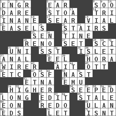 ACROSS 1. Engineer (abbr.) 5. Hearing organ 8. "Barney Miller" actor Jack 11. Have the gumption 12. Portico 14. Three (prefix) 15. Silly 17. Shrivel 18. Small bottle 19. Artist's stands 21. Flight of steps 23. Elected rep. 25. Prong on a fork 26. Former U.S. Attorney General Janet 27. Put into a specified state 28. _-fi 31. University (slang) 33. Fast jet (abbr.) 35. Small island 37. Of or related to the anus 38. Snakelike fish 40. Israeli folk dance 41. One who wires 43. Small island 45. Baseball player Mel 46. And so on (abbr.) 47. Order of Saint Francis (abbr.) 50. Political cartoonist Thomas 52. Inactive volcano in Sicily 53. Australian flightless bird 54. Having greater elevation 56. Oozed 61. Having great length 62. Prepare for publication 65. Having lost freshness 66. A really long time 67. Redecorate 68. ____ Bator 69. Begley and Asner 70. Allow 71. Is not DOWN 1. Singer Brickell 2. Nanny 3. Pate de foie ____ 4. French philosopher Descartes 5. Curvy letter 6. Had dinner 7. Ridicules or criticizes harshly 8. Use a swizzle stick 9. Mouths or openings 10. Petroleum 13. Nick name for Arthur 16. Otherwise 18. Compete 20. Elected reps. 22. Opposed to 24. Sense of smell 26. Cause heat under the collar 28. Groove 29. Certainty 30. Call ___ day 31. A single undivided whole 32. Drug cop 34. Afternoon social gathering 36. Attempt 37. Deep reverence 39. Actor's bit 42. Writer of Portnoy's Complaint (1969) 44. Scottish caps 48. Contemptuous expression 49. Bundle 51. Institutes legal proceedings 52. Ovum 54. Parka part 55. Lodging establishments 57. Needle case 58. Friends 59. Enthusiasm 60. Undesirable depression on a surface 61. Area sheltered from the wind 63. Binary compound 64. Small child