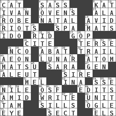 ACROSS 1. Domesticated feline 4. Backtalk 8. Krazy ___ of comics 11. _ the terrible 13. Baking chambers 15. In the manner of 16. Loose flowing garment 17. Brizilian seaport 18. Enthusiastic 19. Debaucheries 21. Health resort 22. Floor protectors 23. Wedding promise 24. To free from 27. Grand Old Party 29. Quote 30. Laconic 34. Non-commissioned officer (abbr.) 36. Blind as ____ 39. Get behind 40. Period of immesurable duration 41. Type of eclipse 43. Smallest unit of an element 44. Taiwanese island in East China Sea 46. "Two Mules for Sister ____" 47. Commissioned military rank (abbr.) 48. Native American of Southwest Alaska 49. Male parent of an animal 51. Cartoonist voice _ Blanc 53. _ tizzy (2 wds.) 54. Compass dir. 57. The longest river in the world 60. Order of Saint Francis (abbr.) 63. Prepares for publication 65. Among 66. Compose 69. A single undivided whole 70. Scottish cap 71. Beverly of Met fame 72. Stare 73. Sight organ 74. Religious group 75. Raised railways DOWN 1. High-altitude cloud 2. Stay clear from 3. Off limits 4. Male offspring 5. Actress Gardner 6. Puts into a specified state 7. Fastener 8. Polynesian shrub of the pepper family 9. Came down and settled, as after flight 10. Small boys 12. Remaining after all deductions 14. Volcanic refuse 18. Electrical Measurement 20. Indian title of respect (Mr.) 25. Slanted text style (abbr.) 26. Alight from a bus 28. Baseball player Mel 29. Ingested 31. Assign a rank or rating to 32. The Jewish people; Israel 33. Shade tree 34. Be tempered by heat 35. ____ d'Azur (French Riviera) 37. Santa ___, CA 38. Tarsus (plural) 40. Wet nurse (var.) 42. Water falling in drops from the sky 45. Shoshoni 50. Actress Charlotte 52. Moos 54. Burn superficially 55. Free of sound 56. _____ Park, CO 57. Nathan's nickname 58. "If ____ say so..." 59. Citrus frut 61. Indian titles of respect 62. Do some clerical work 64. Superhero pair 67. Affectionate concern, for short 68. Eastern Standard Time (abbr.)